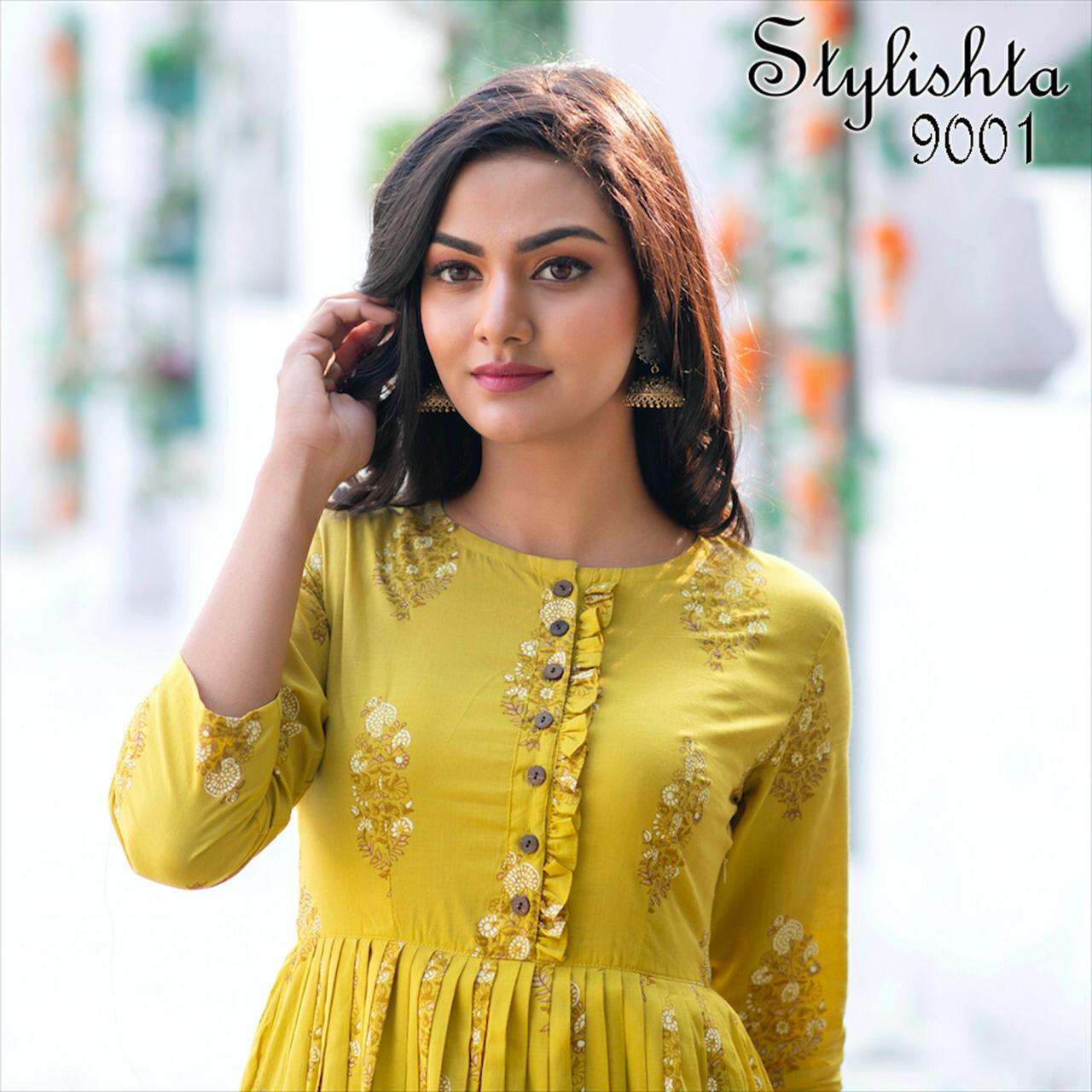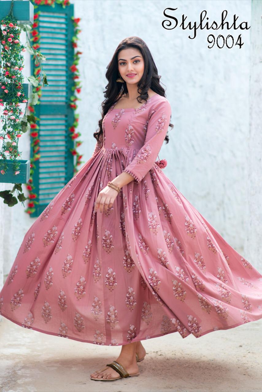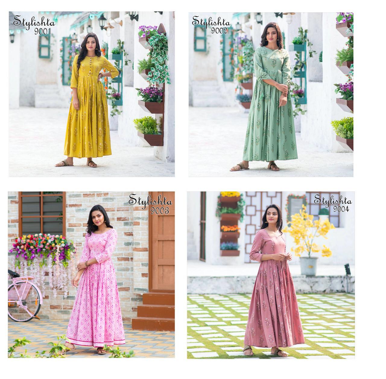 ?We have launch our ne w series Stylishta - For upcoming seasons? New Printed Stylish Flair Kurtis collections Fabric Details :- Gown :- Maslin Fabric. Work :- Digital Printed. Inner :- Full inner In all Designs. Length :- Max up to 55 inch. Flair :- 4 to 4.5 Meter. Size :- M(38), L(40), XL(42), XXL(44). Type :- stitched. Weight :- 700 gms. Total 4 Designs. Rate- 849 per pcs GST 5 Percent Extra. Delivery from today Single 949+gst |