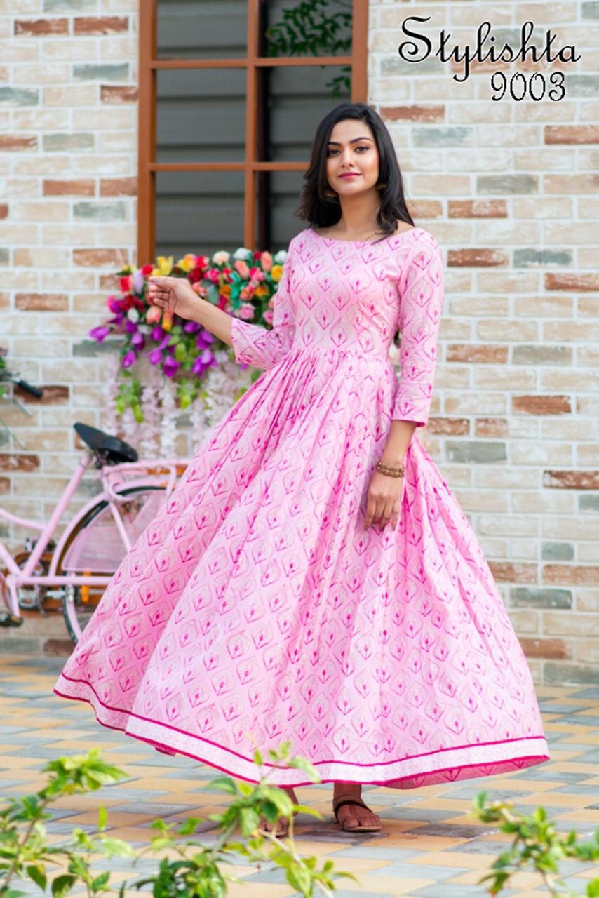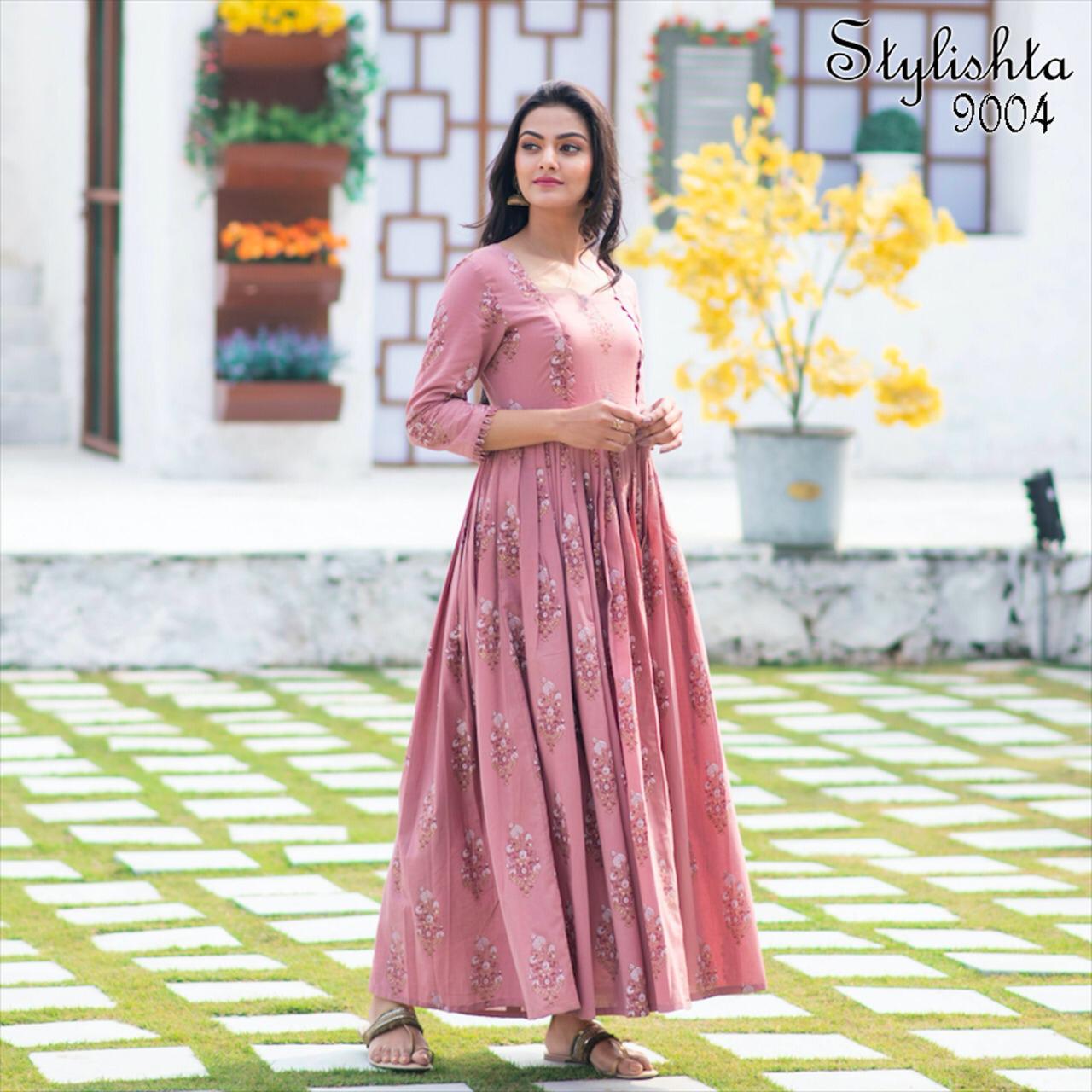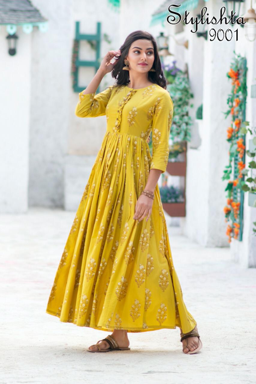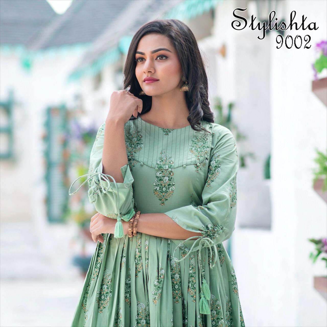 ?We have launch our ne w series Stylishta - For upcoming seasons? New Printed Stylish Flair Kurtis collections Fabric Details :- Gown :- Maslin Fabric. Work :- Digital Printed. Inner :- Full inner In all Designs. Length :- Max up to 55 inch. Flair :- 4 to 4.5 Meter. Size :- M(38), L(40), XL(42), XXL(44). Type :- stitched. Weight :- 700 gms. Total 4 Designs. Rate- 849 per pcs GST 5 Percent Extra. Delivery from today Single 949+gst |