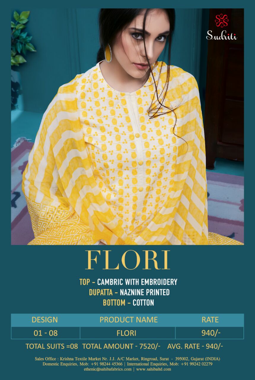 Buy Online Sudriti Flori Cambric Embroidery Salwar Kameez Dealer 8 Pcs of Full Catalogue at Wholesale Price. Looking for Sudriti Flori Cambric Embroidery Salwar Kameez Dealer Full Catalouge at Best Price? Buy Now Sudriti Flori Cambric Embroidery Salwar Kameez Dealer at Wholesale Rate of Rs 7520 with Total 8 Pcs from authroized dealer and supplier of SUDRITI Brand. Cost of Each piece is just only Rs 940 which is very low and affordable price to resale the product in your retail store ,This is Surat based Wholesale Supplier & Dealer of SUDRITI Brand. Click on Brand name to Know more about SUDRITI Brand's products.Call or Whatsapp on 9898838984 for booking or enquiry