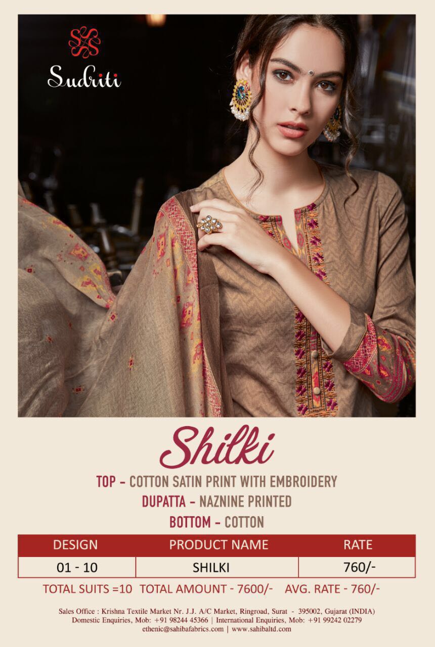 Buy Online Sudriti Shilki 1 To 10 Series Cotton Satin Print Suit Dealer 10 Pcs of Full Catalogue at Wholesale Price. Looking for Sudriti Shilki 1 To 10 Series Cotton Satin Print Suit Dealer Full Catalouge at Best Price? Buy Now Sudriti Shilki 1 To 10 Series Cotton Satin Print Suit Dealer at Wholesale Rate of Rs 7600 with Total 10 Pcs from authroized dealer and supplier of SUDRITI Brand. Cost of Each piece is just only Rs 760 which is very low and affordable price to resale the product in your retail store ,This is Surat based Wholesale Supplier & Dealer of SUDRITI Brand. Click on Brand name to Know more about SUDRITI Brand's products.Call or Whatsapp on 9898838984 for booking or enquiry