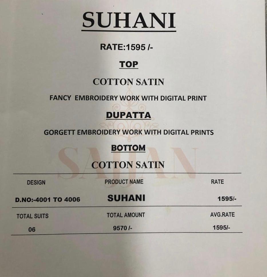 Buy Online Suhaani By Relssa 4001 Series Fancy Cotton Satin Printed Salwar Kameez Catlog Wholesale Dealer Surat 6 Pcs of Full Catalogue at Wholesale Price. Looking for Suhaani By Relssa 4001 Series Fancy Cotton Satin Printed Salwar Kameez Catlog Wholesale Dealer Surat Full Catalouge at Best Price? Buy Now Suhaani By Relssa 4001 Series Fancy Cotton Satin Printed Salwar Kameez Catlog Wholesale Dealer Surat at Wholesale Rate of Rs 9570 with Total 6 Pcs from authroized dealer and supplier of Brand. Cost of Each piece is just only Rs 1595 which is very low and affordable price to resale the product in your retail store ,This is Surat based Wholesale Supplier & Dealer of Brand. Click on Brand name to Know more about Brand's products.Call or Whatsapp on 9898838984 for booking or enquiry