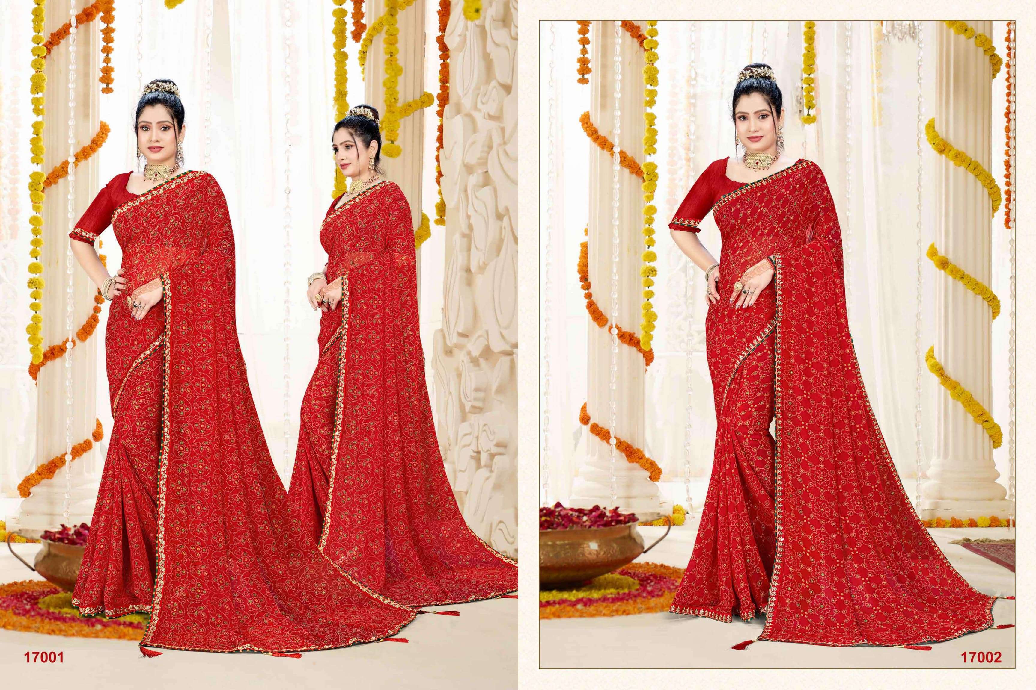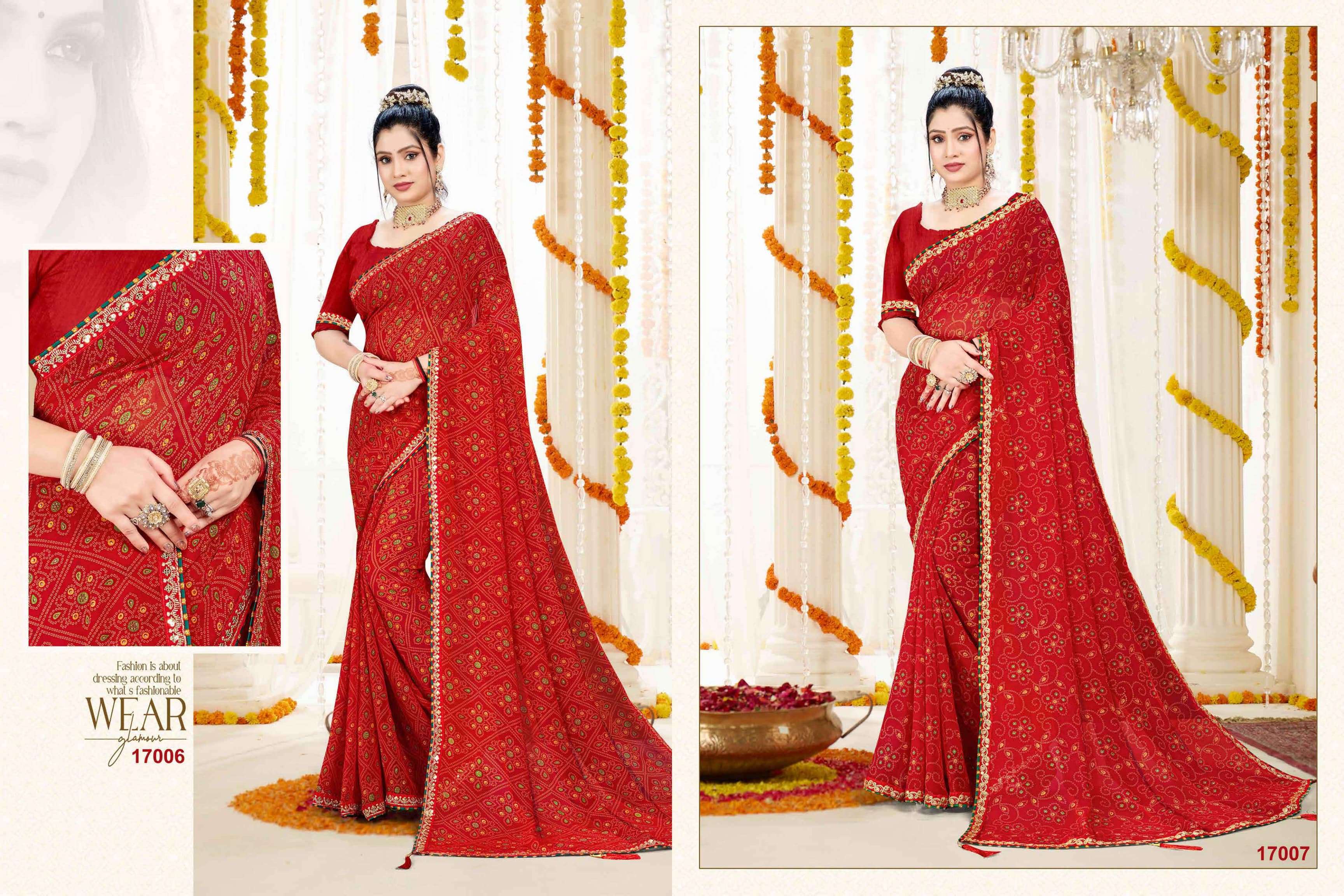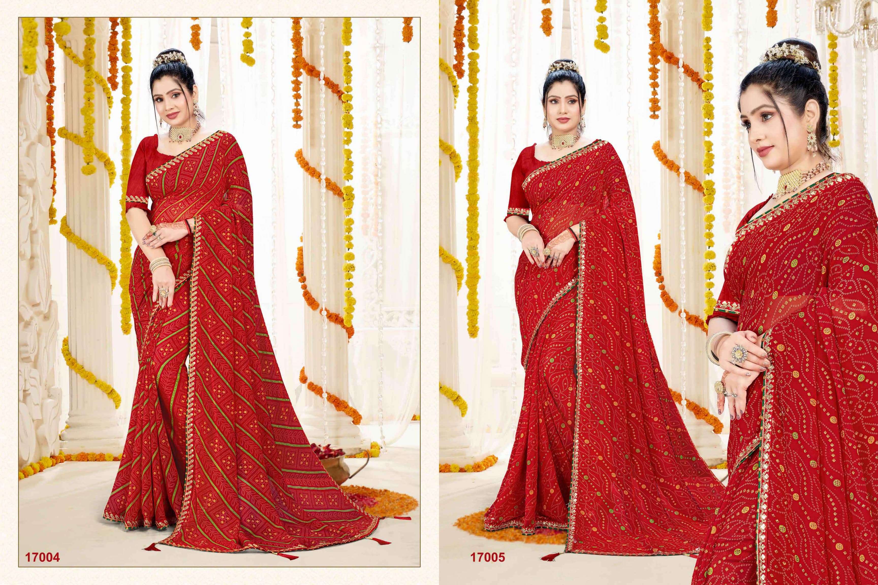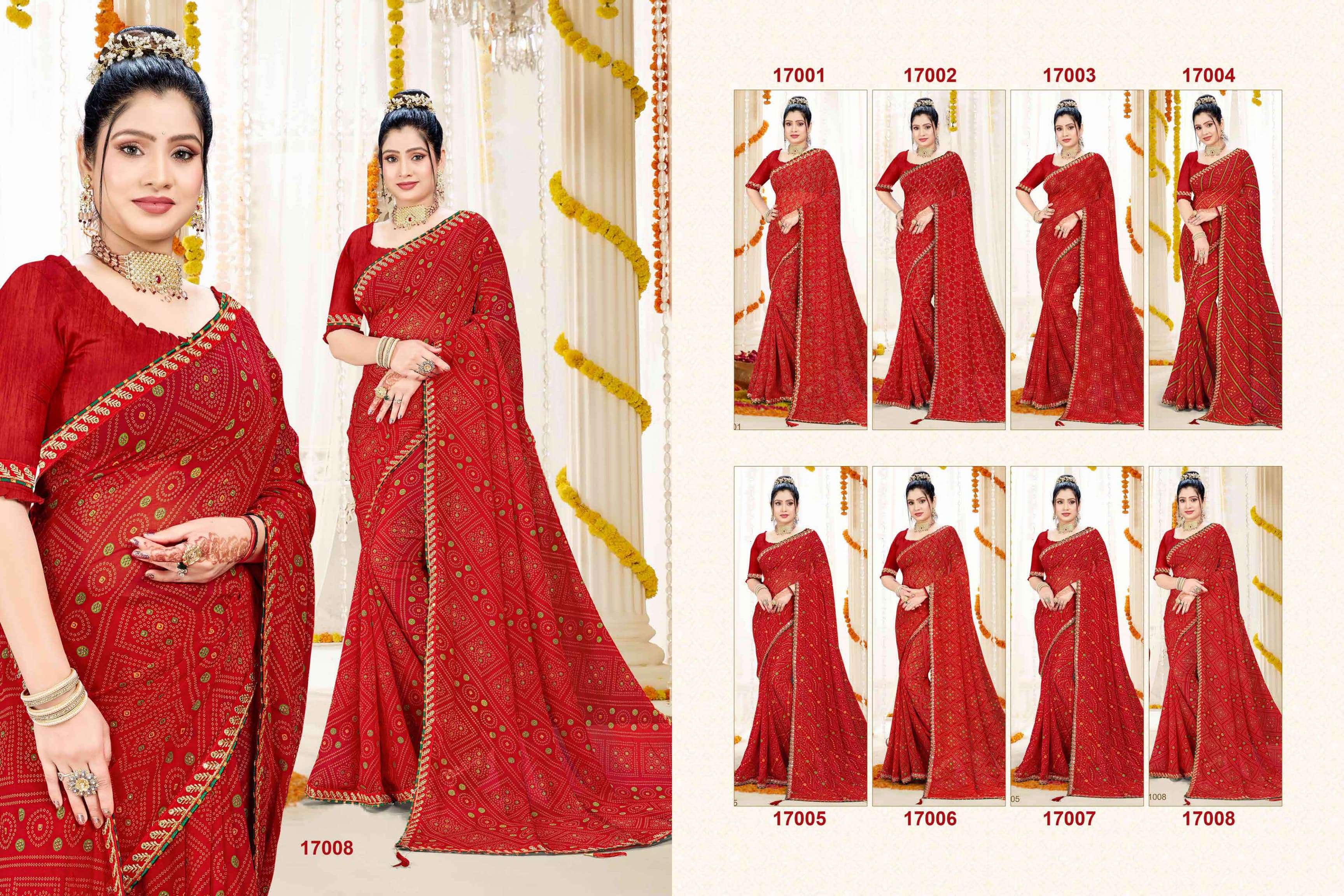 *NEW DESIGEN PURE RED COLOUR BANDHEJ CATALOUGE WITH FANCY WORK BORDER IN RED VALVET* BRAND - *JALNIDHI* CATLOG NAME- *SUHAG*😍 PCS - *8 PCS* RATE - *550/-* SERISE - *17001 TO 17008* FABRIC - *HEAVY JARI GORGET*👌👌 BLOUSE - *HEAVY BANGLORI* Gst 5℅ Extra SINGLE AVAILABLE Book your order now |