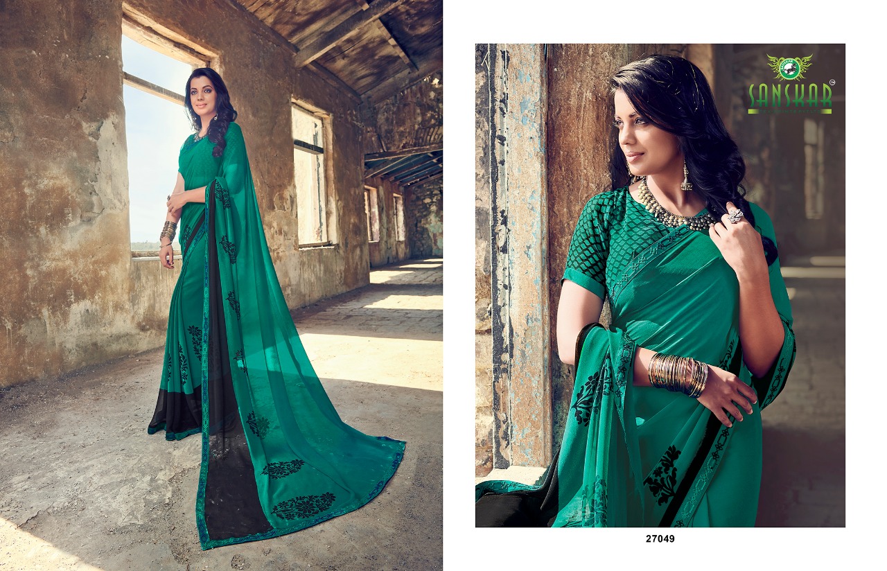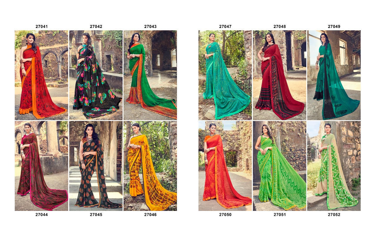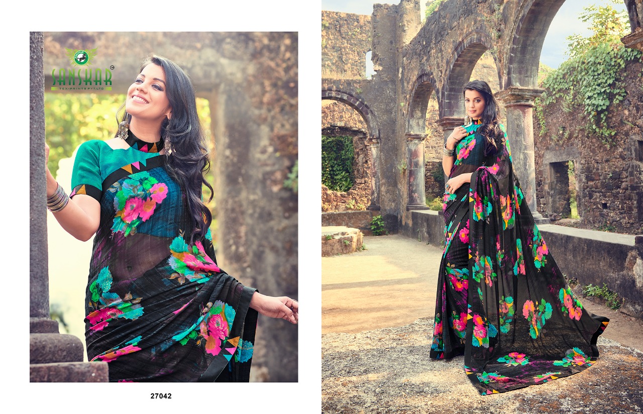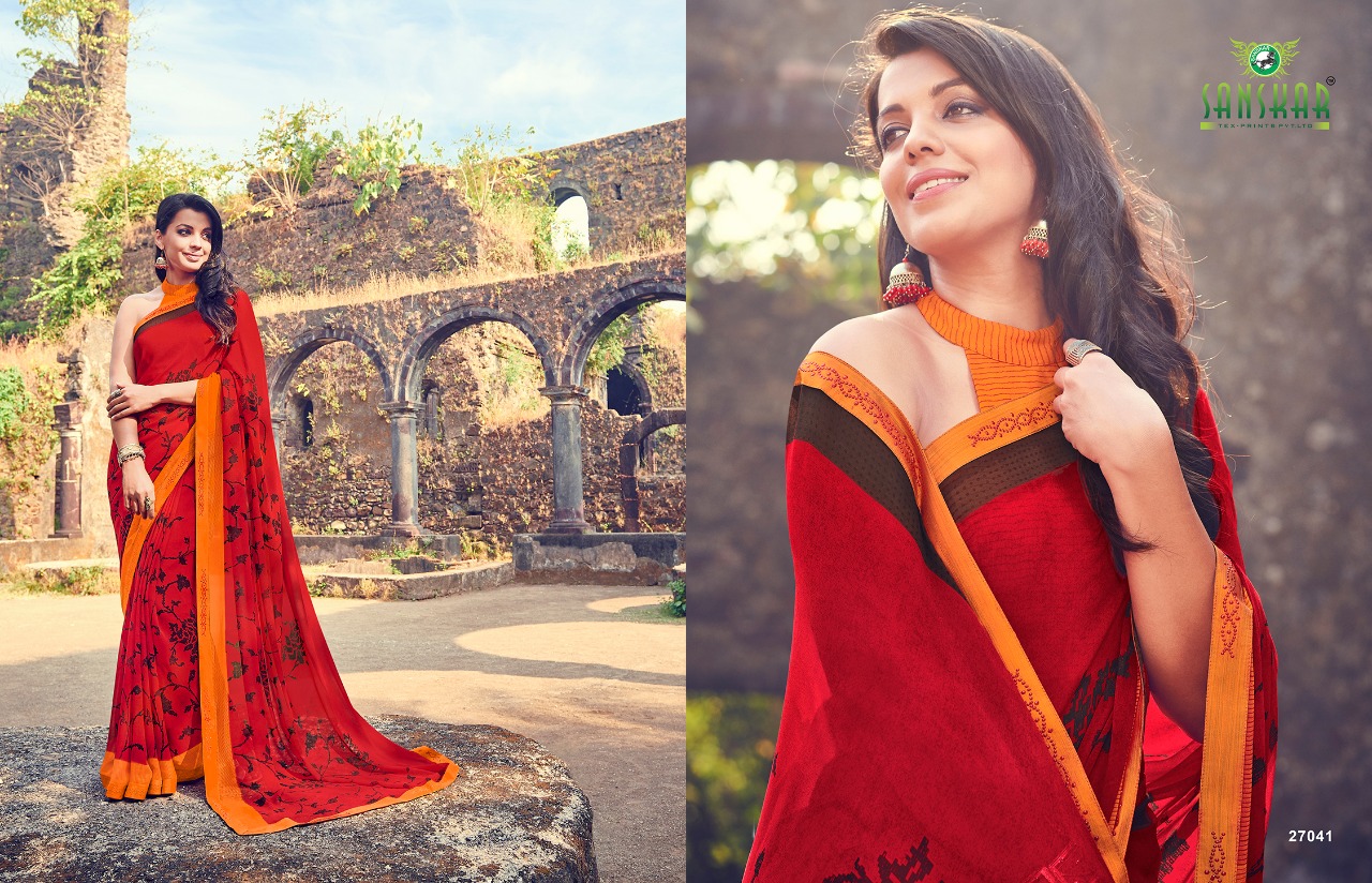 Buy Online Suhana Safar By Sanskar 27041 Series Fancy Georgette Printed Saree Collection Wholesaler Surat 12 Pcs of Full Catalogue at Wholesale Price. Looking for Suhana Safar By Sanskar 27041 Series Fancy Georgette Printed Saree Collection Wholesaler Surat Full Catalouge at Best Price? Buy Now Suhana Safar By Sanskar 27041 Series Fancy Georgette Printed Saree Collection Wholesaler Surat at Wholesale Rate of Rs 7980 with Total 12 Pcs from authroized dealer and supplier of SANSKAR SAREES Brand. Cost of Each piece is just only Rs 665 which is very low and affordable price to resale the product in your retail store ,This is Surat based Wholesale Supplier & Dealer of SANSKAR SAREES Brand. Click on Brand name to Know more about SANSKAR SAREES Brand's products.Call or Whatsapp on 9898838984 for booking or enquiry