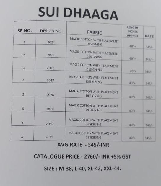 Buy Online Sui Dhaaga By Kirara 2024 Series Fancy Cotton Kurti Catlog Wholesaler Surat 8 Pcs of Full Catalogue at Wholesale Price. Looking for Sui Dhaaga By Kirara 2024 Series Fancy Cotton Kurti Catlog Wholesaler Surat Full Catalouge at Best Price? Buy Now Sui Dhaaga By Kirara 2024 Series Fancy Cotton Kurti Catlog Wholesaler Surat at Wholesale Rate of Rs 2760 with Total 8 Pcs from authroized dealer and supplier of Kirara Brand. Cost of Each piece is just only Rs 345 which is very low and affordable price to resale the product in your retail store ,This is Surat based Wholesale Supplier & Dealer of Kirara Brand. Click on Brand name to Know more about Kirara Brand's products.Call or Whatsapp on 9898838984 for booking or enquiry