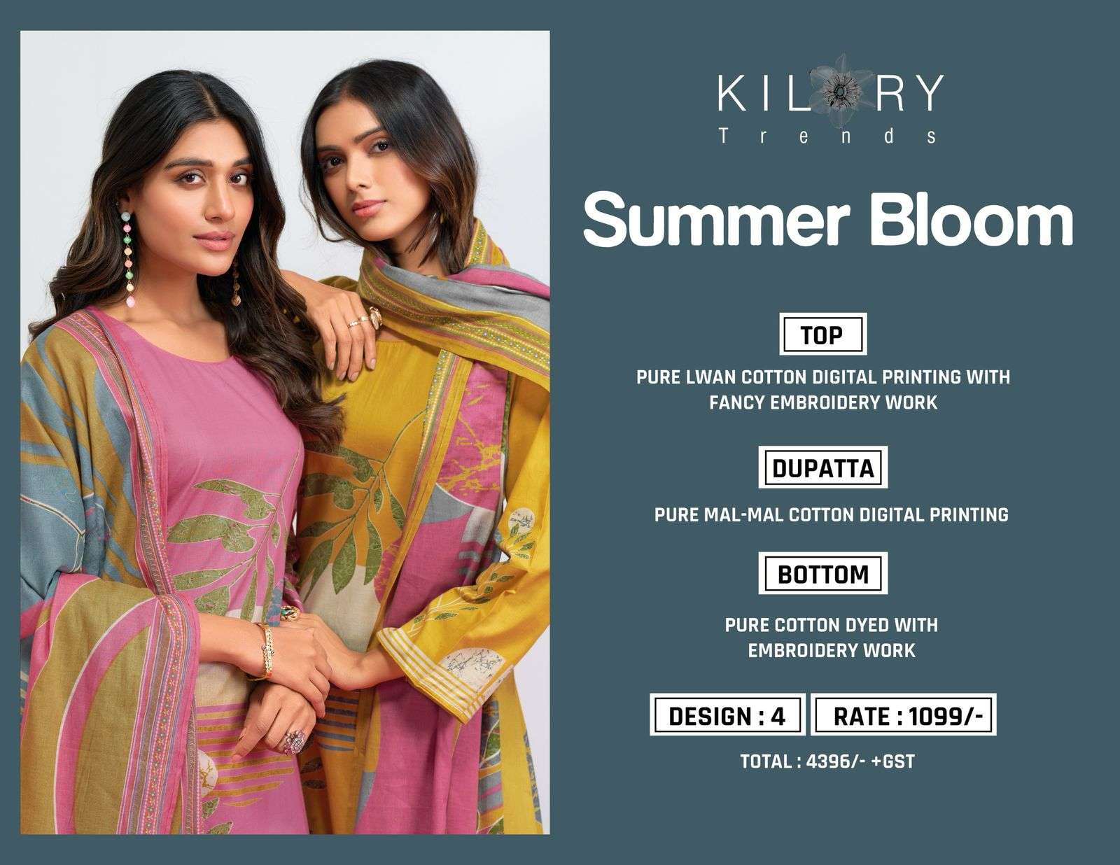Buy Online Summer Bloom by KILORY TRENDS DIGITAL print suit collection manufacturer surat 4 Pcs of Full Catalogue at Wholesale Price. Looking for Summer Bloom by KILORY TRENDS DIGITAL print suit collection manufacturer surat Full Catalouge at Best Price? Buy Now Summer Bloom by KILORY TRENDS DIGITAL print suit collection manufacturer surat at Wholesale Rate of Rs 4396 with Total 4 Pcs from authroized dealer and supplier of Kilory Trendz Brand. Cost of Each piece is just only Rs 1099 which is very low and affordable price to resale the product in your retail store ,This is Surat based Wholesale Supplier & Dealer of Kilory Trendz Brand. Click on Brand name to Know more about Kilory Trendz Brand's products.Call or Whatsapp on 9898838984 for booking or enquiry
