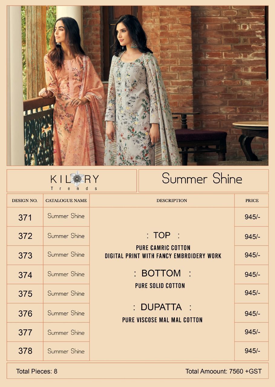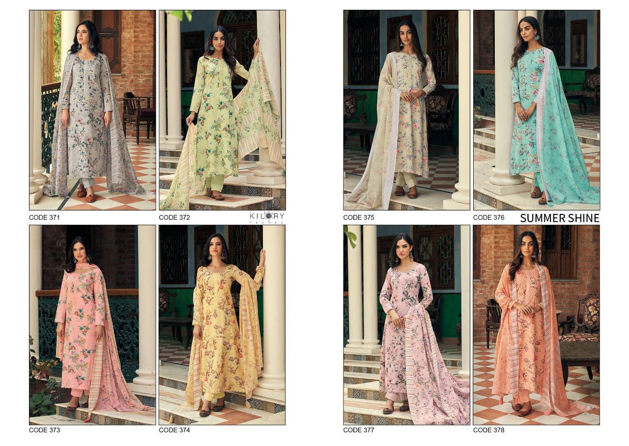 Buy Online Summer Shine By Kilory Trendz Designer Suits Dealer And Exporter Surat Gujarat 8 Pcs of Full Catalogue at Wholesale Price. Looking for Summer Shine By Kilory Trendz Designer Suits Dealer And Exporter Surat Gujarat Full Catalouge at Best Price? Buy Now Summer Shine By Kilory Trendz Designer Suits Dealer And Exporter Surat Gujarat at Wholesale Rate of Rs 7560 with Total 8 Pcs from authroized dealer and supplier of Kilory Trendz Brand. Cost of Each piece is just only Rs 945 which is very low and affordable price to resale the product in your retail store ,This is Surat based Wholesale Supplier & Dealer of Kilory Trendz Brand. Click on Brand name to Know more about Kilory Trendz Brand's products.Call or Whatsapp on 9898838984 for booking or enquiry