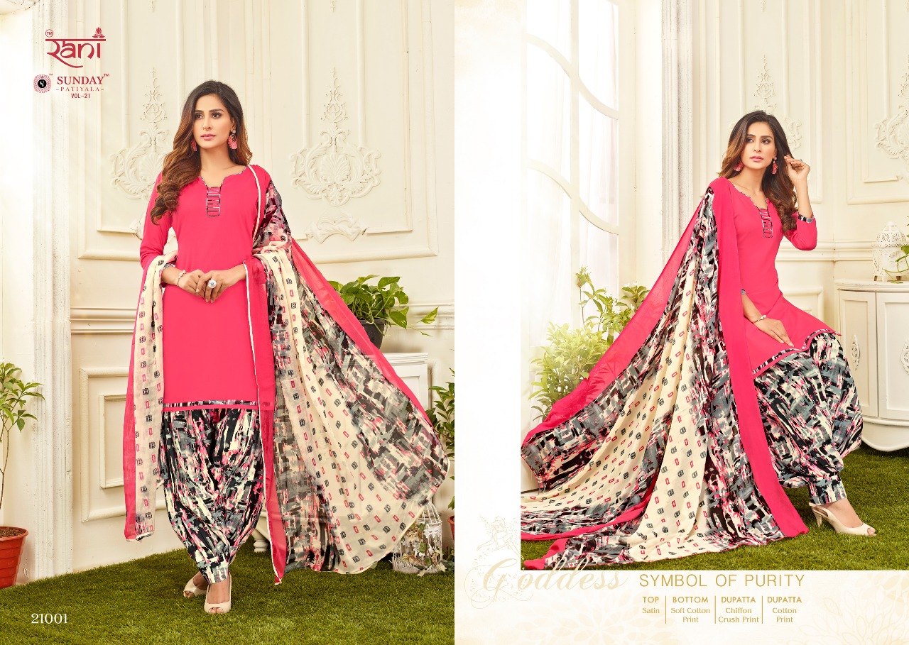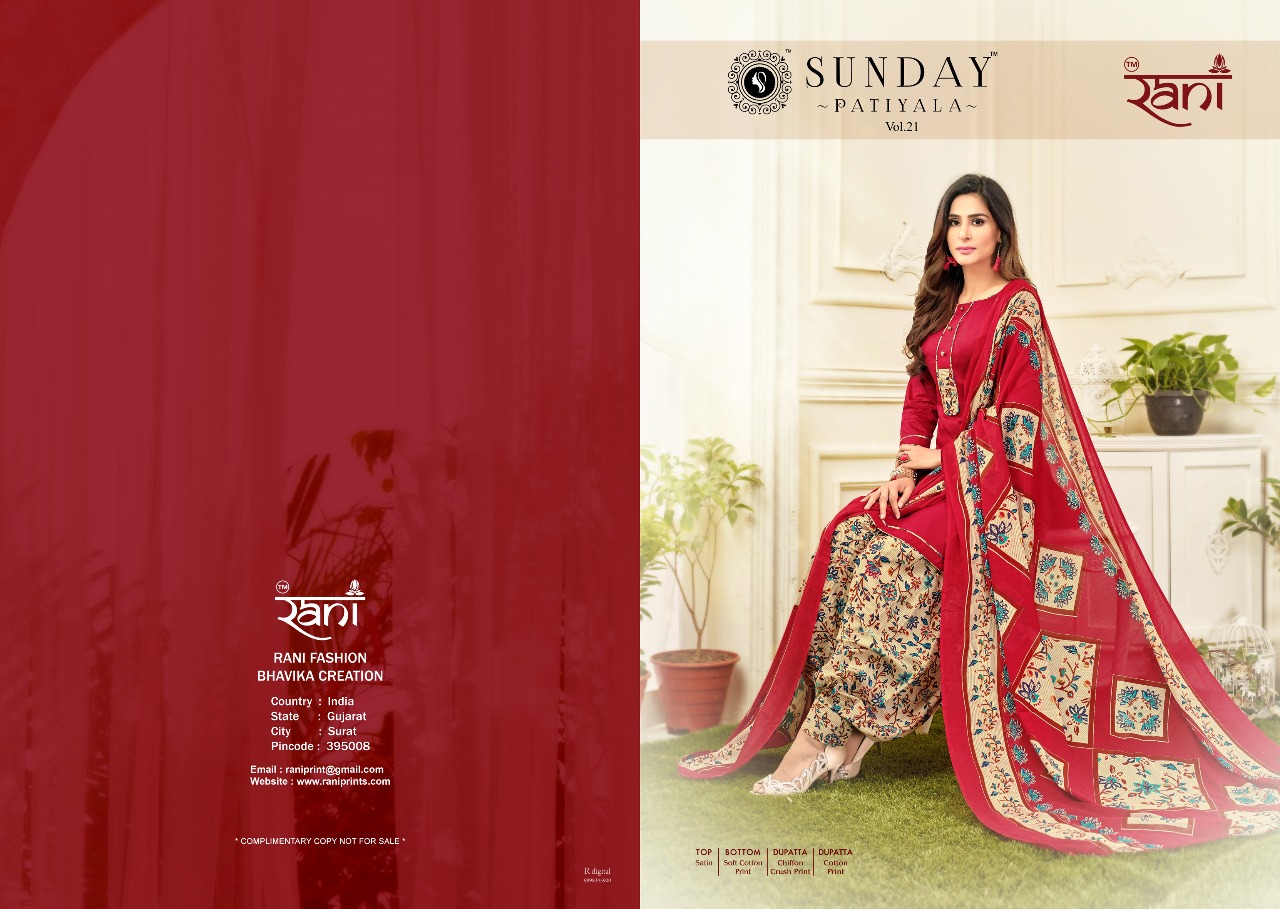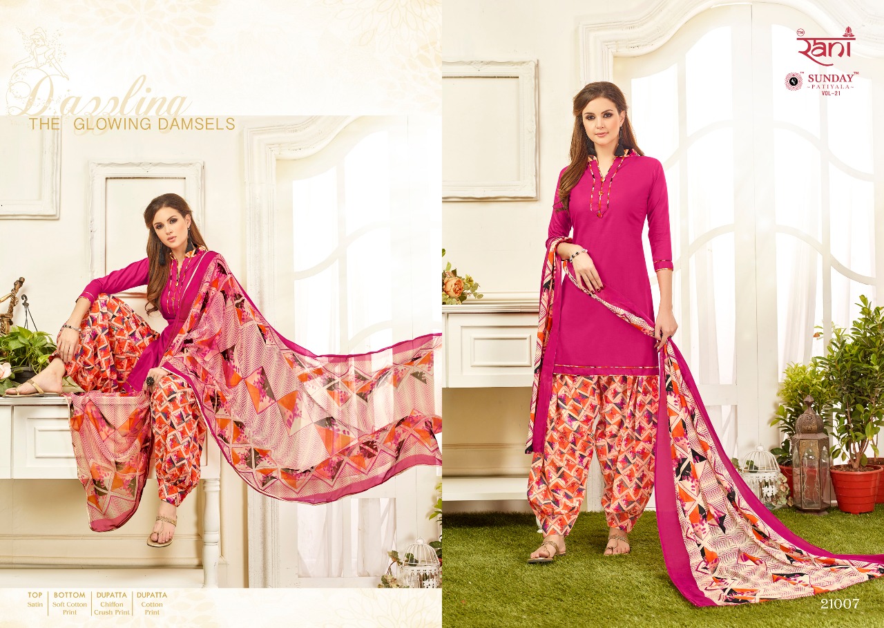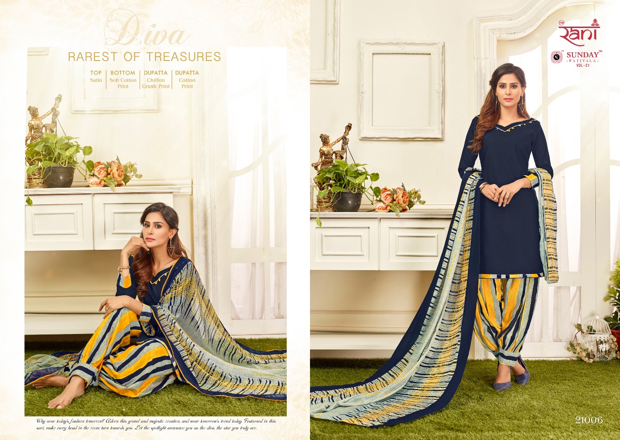 Buy Online Sunday Patiyala Vol 21 By Rani Studio 21001 Series Fancy Glace Cotton Patiyala Suit Catlog Wholesaler And Supplier Surat 12 Pcs of Full Catalogue at Wholesale Price. Looking for Sunday Patiyala Vol 21 By Rani Studio 21001 Series Fancy Glace Cotton Patiyala Suit Catlog Wholesaler And Supplier Surat Full Catalouge at Best Price? Buy Now Sunday Patiyala Vol 21 By Rani Studio 21001 Series Fancy Glace Cotton Patiyala Suit Catlog Wholesaler And Supplier Surat at Wholesale Rate of Rs 5700 with Total 12 Pcs from authroized dealer and supplier of RANI Brand. Cost of Each piece is just only Rs 475 which is very low and affordable price to resale the product in your retail store ,This is Surat based Wholesale Supplier & Dealer of RANI Brand. Click on Brand name to Know more about RANI Brand's products.Call or Whatsapp on 9898838984 for booking or enquiry