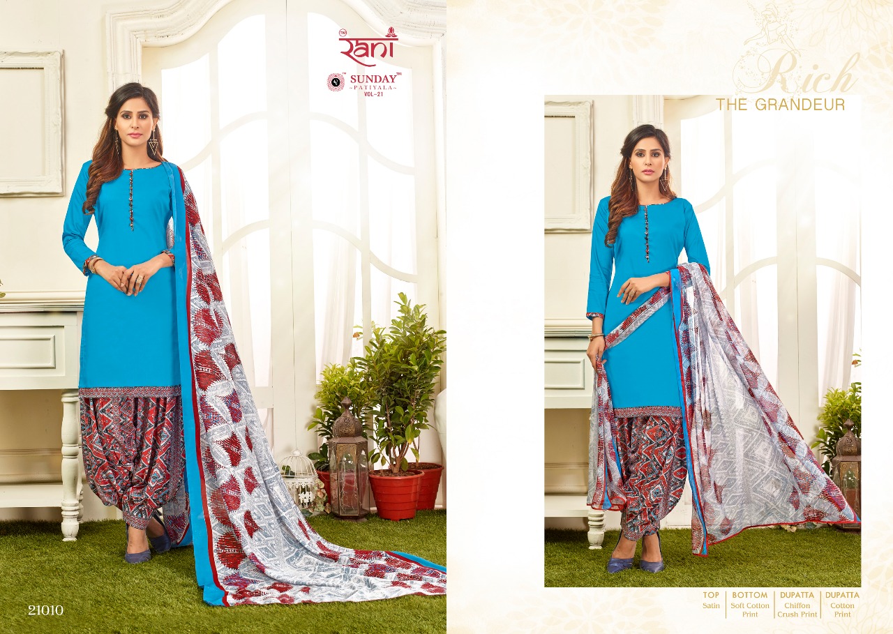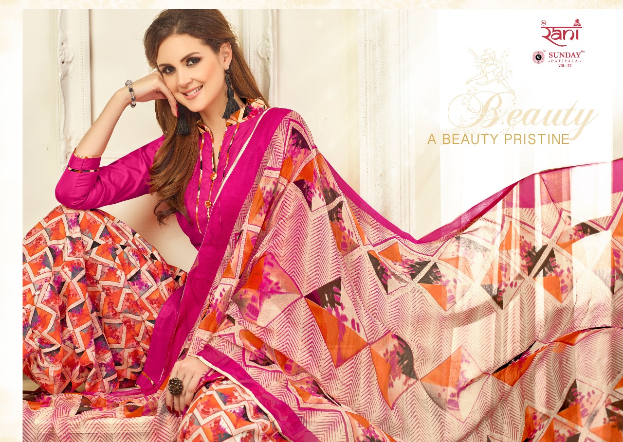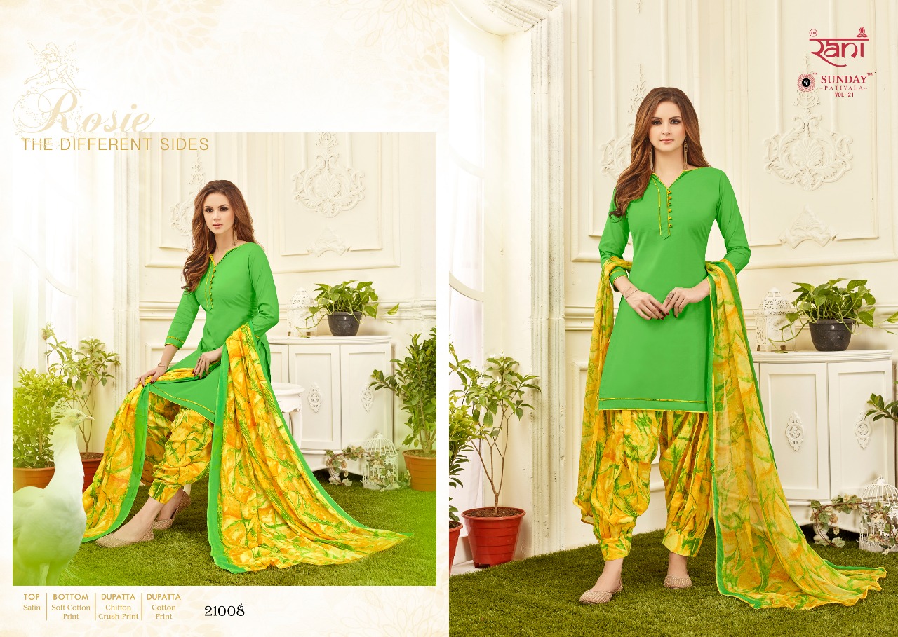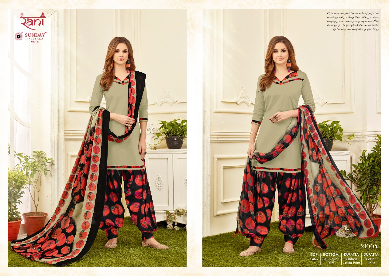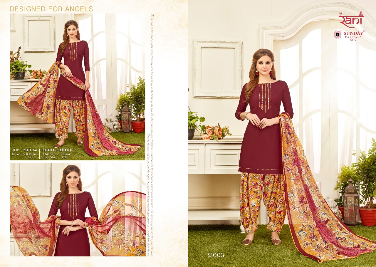 Buy Online Sunday Patiyala Vol 21 By Rani Studio 21001 Series Fancy Glace Cotton Patiyala Suit Catlog Wholesaler And Supplier Surat 12 Pcs of Full Catalogue at Wholesale Price. Looking for Sunday Patiyala Vol 21 By Rani Studio 21001 Series Fancy Glace Cotton Patiyala Suit Catlog Wholesaler And Supplier Surat Full Catalouge at Best Price? Buy Now Sunday Patiyala Vol 21 By Rani Studio 21001 Series Fancy Glace Cotton Patiyala Suit Catlog Wholesaler And Supplier Surat at Wholesale Rate of Rs 5700 with Total 12 Pcs from authroized dealer and supplier of RANI Brand. Cost of Each piece is just only Rs 475 which is very low and affordable price to resale the product in your retail store ,This is Surat based Wholesale Supplier & Dealer of RANI Brand. Click on Brand name to Know more about RANI Brand's products.Call or Whatsapp on 9898838984 for booking or enquiry