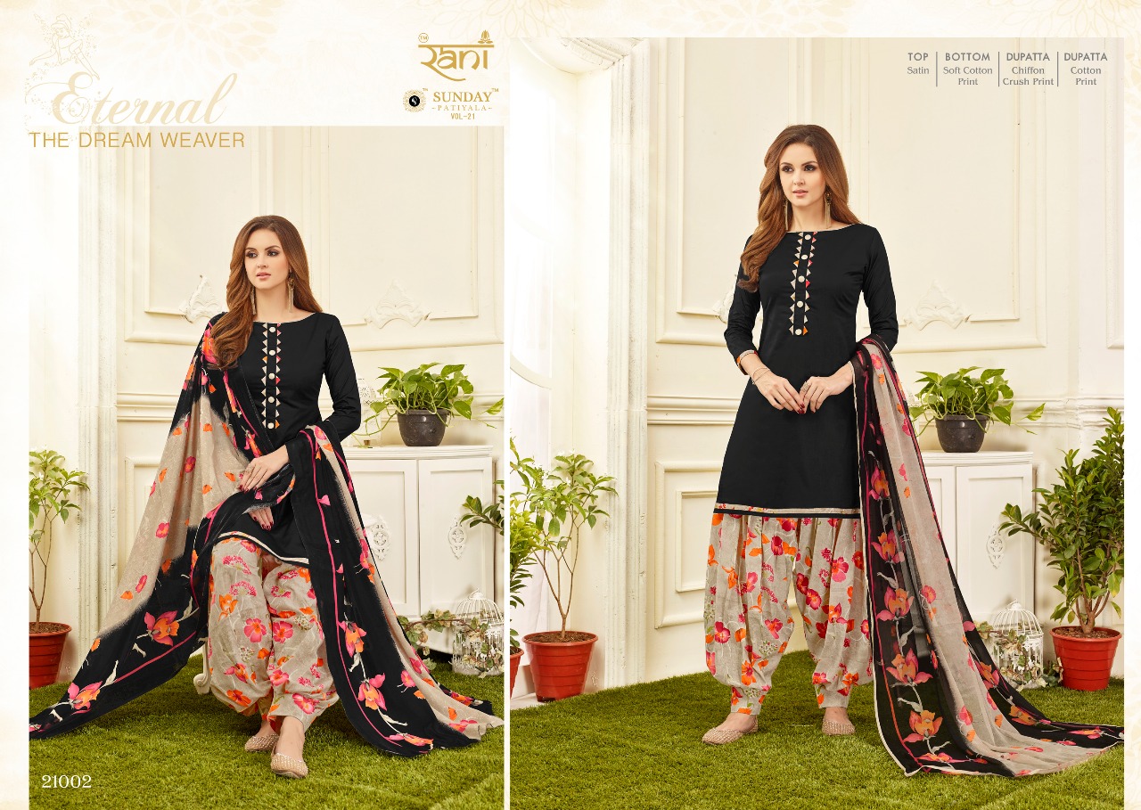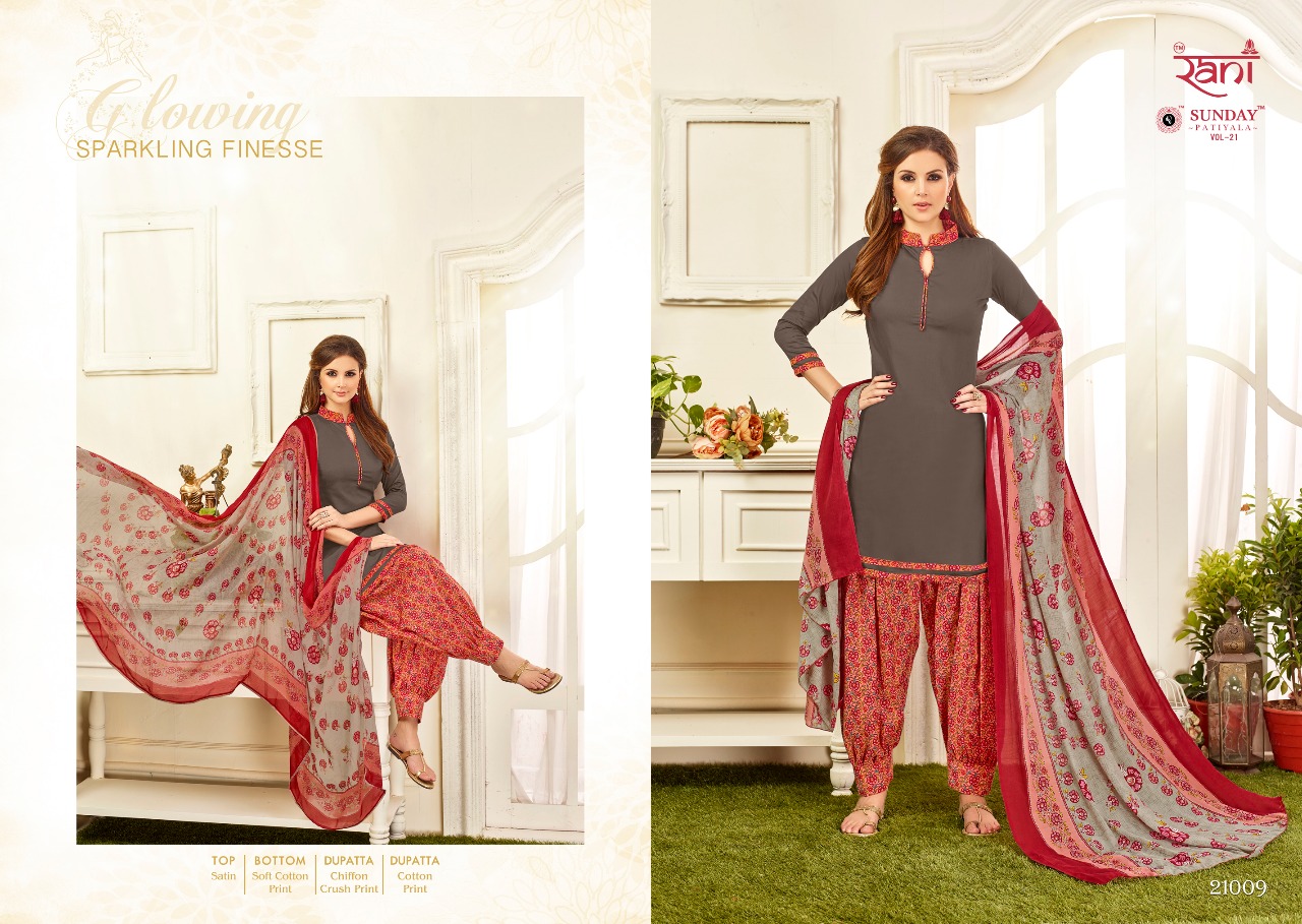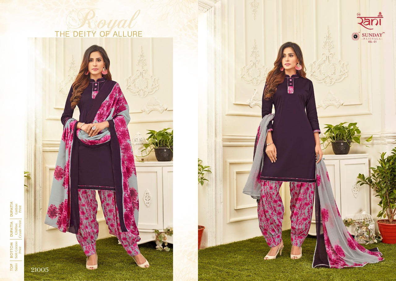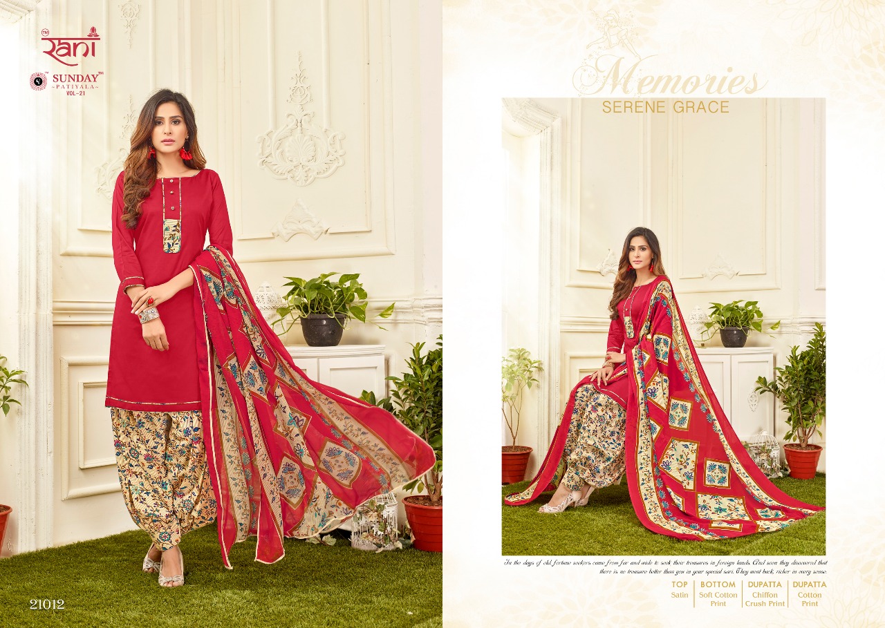 Buy Online Sunday Patiyala Vol 21 By Rani Studio 21001 Series Fancy Glace Cotton Patiyala Suit Catlog Wholesaler And Supplier Surat 12 Pcs of Full Catalogue at Wholesale Price. Looking for Sunday Patiyala Vol 21 By Rani Studio 21001 Series Fancy Glace Cotton Patiyala Suit Catlog Wholesaler And Supplier Surat Full Catalouge at Best Price? Buy Now Sunday Patiyala Vol 21 By Rani Studio 21001 Series Fancy Glace Cotton Patiyala Suit Catlog Wholesaler And Supplier Surat at Wholesale Rate of Rs 5700 with Total 12 Pcs from authroized dealer and supplier of RANI Brand. Cost of Each piece is just only Rs 475 which is very low and affordable price to resale the product in your retail store ,This is Surat based Wholesale Supplier & Dealer of RANI Brand. Click on Brand name to Know more about RANI Brand's products.Call or Whatsapp on 9898838984 for booking or enquiry