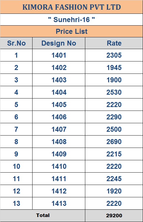 Buy Online Sunehri Vol 16 By Kimora Fashion Dealer And Exporter In Surat 13 Pcs of Full Catalogue at Wholesale Price. Looking for Sunehri Vol 16 By Kimora Fashion Dealer And Exporter In Surat Full Catalouge at Best Price? Buy Now Sunehri Vol 16 By Kimora Fashion Dealer And Exporter In Surat at Wholesale Rate of Rs 0 with Total 13 Pcs from authroized dealer and supplier of KIMORA Brand. Cost of Each piece is just only Rs 0 which is very low and affordable price to resale the product in your retail store ,This is Surat based Wholesale Supplier & Dealer of KIMORA Brand. Click on Brand name to Know more about KIMORA Brand's products.Call or Whatsapp on 9898838984 for booking or enquiry