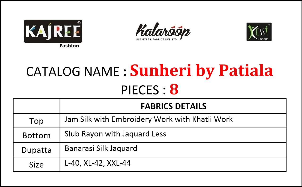 Buy Online Sunheri By Patiyala By Kalaroop Jam Silk Suits Wholesale Supplier Surat 8 Pcs of Full Catalogue at Wholesale Price. Looking for Sunheri By Patiyala By Kalaroop Jam Silk Suits Wholesale Supplier Surat Full Catalouge at Best Price? Buy Now Sunheri By Patiyala By Kalaroop Jam Silk Suits Wholesale Supplier Surat at Wholesale Rate of Rs 8792 with Total 8 Pcs from authroized dealer and supplier of Brand. Cost of Each piece is just only Rs 1099 which is very low and affordable price to resale the product in your retail store ,This is Surat based Wholesale Supplier & Dealer of Brand. Click on Brand name to Know more about Brand's products.Call or Whatsapp on 9898838984 for booking or enquiry