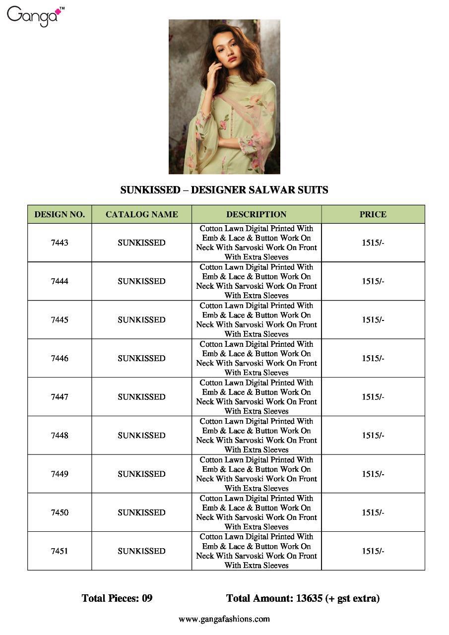 *GANGA* Presents its latest designer salwar suits catalogue *SUNKISSED* TOP-COTTON LAWN DIGITAL PRINT WITH EMBROIDERY AND LACE AND BUTTON WORK ON NECK WITH SAROVSKI WORK ON FRONT AND EXTRA SLEEVES BOTTOM-COTTON SOLID DUPATTA-PURE BEMBERG CHIFFON PRINTED *1515?* 5%GST APPLICABLE SET TO SET DELIVERY 2 DAYS |