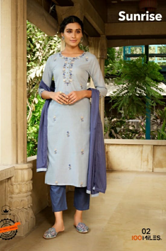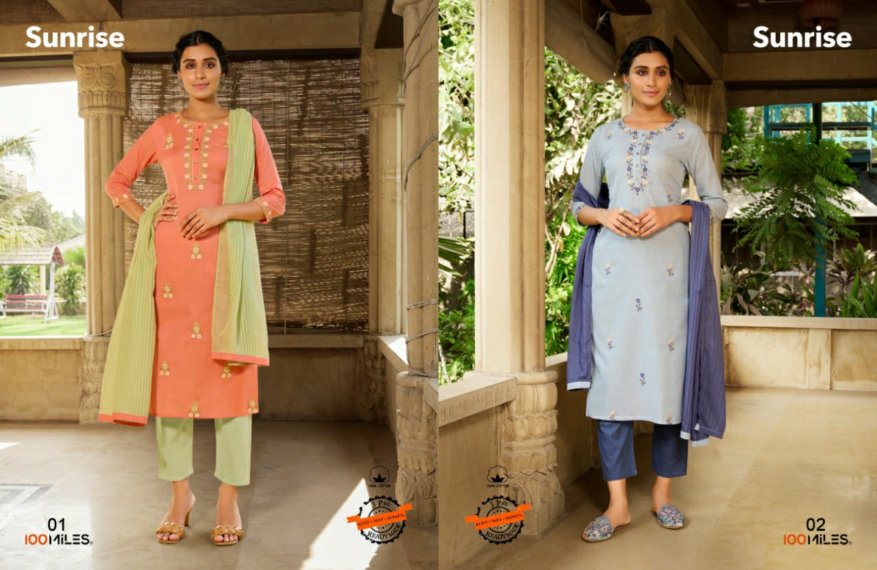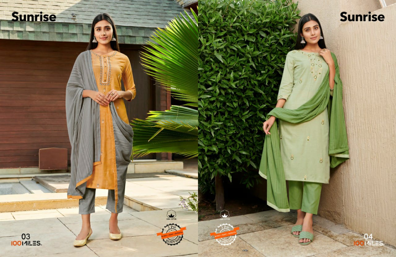 Buy Online Sunrise Kurti With Pant And Dupatta By 100 Miles Dealer And Exporter Surat Gujarat 6 Pcs of Full Catalogue at Wholesale Price. Looking for Sunrise Kurti With Pant And Dupatta By 100 Miles Dealer And Exporter Surat Gujarat Full Catalouge at Best Price? Buy Now Sunrise Kurti With Pant And Dupatta By 100 Miles Dealer And Exporter Surat Gujarat at Wholesale Rate of Rs 4650 with Total 6 Pcs from authroized dealer and supplier of 100 MILES Brand. Cost of Each piece is just only Rs 775 which is very low and affordable price to resale the product in your retail store ,This is Surat based Wholesale Supplier & Dealer of 100 MILES Brand. Click on Brand name to Know more about 100 MILES Brand's products.Call or Whatsapp on 9898838984 for booking or enquiry