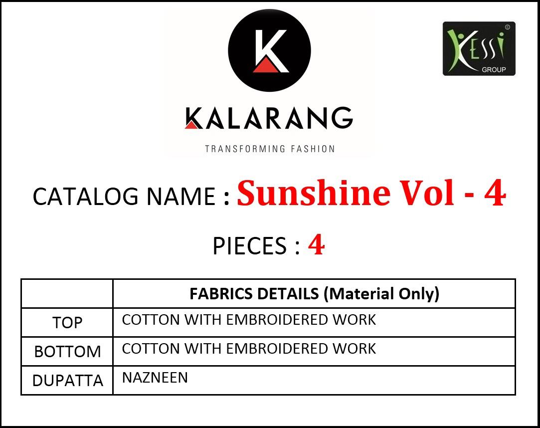 Buy Online Sunshine Vol 4 By Kalarang Cotton Embroidered Suits Wholesale Supplier Surat 4 Pcs of Full Catalogue at Wholesale Price. Looking for Sunshine Vol 4 By Kalarang Cotton Embroidered Suits Wholesale Supplier Surat Full Catalouge at Best Price? Buy Now Sunshine Vol 4 By Kalarang Cotton Embroidered Suits Wholesale Supplier Surat at Wholesale Rate of Rs 1996 with Total 4 Pcs from authroized dealer and supplier of KALARANG Brand. Cost of Each piece is just only Rs 499 which is very low and affordable price to resale the product in your retail store ,This is Surat based Wholesale Supplier & Dealer of KALARANG Brand. Click on Brand name to Know more about KALARANG Brand's products.Call or Whatsapp on 9898838984 for booking or enquiry