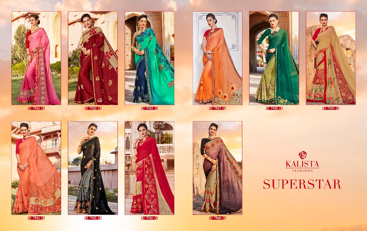Buy Online Super Star By Kalista Party Wear Desinger Sarees Wholesale Supplier And Dealer Surat 10 Pcs of Full Catalogue at Wholesale Price. Looking for Super Star By Kalista Party Wear Desinger Sarees Wholesale Supplier And Dealer Surat Full Catalouge at Best Price? Buy Now Super Star By Kalista Party Wear Desinger Sarees Wholesale Supplier And Dealer Surat at Wholesale Rate of Rs 7750 with Total 10 Pcs from authroized dealer and supplier of KALISTA FASHION Brand. Cost of Each piece is just only Rs 775 which is very low and affordable price to resale the product in your retail store ,This is Surat based Wholesale Supplier & Dealer of KALISTA FASHION Brand. Click on Brand name to Know more about KALISTA FASHION Brand's products.Call or Whatsapp on 9898838984 for booking or enquiry