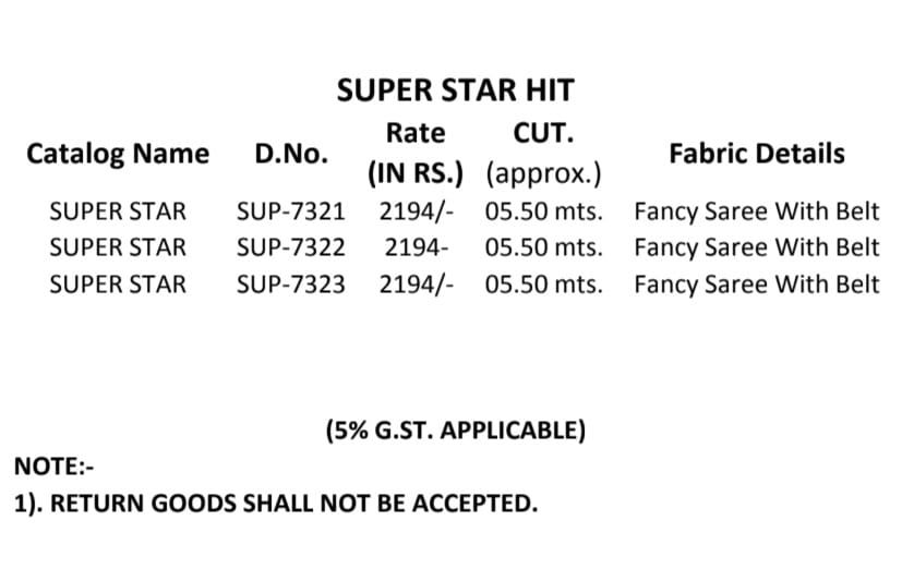 Buy Online Super Star Hits The Fashion Hub Fancy Belt Sarees 3 Pcs of Full Catalogue at Wholesale Price. Looking for Super Star Hits The Fashion Hub Fancy Belt Sarees Full Catalouge at Best Price? Buy Now Super Star Hits The Fashion Hub Fancy Belt Sarees at Wholesale Rate of Rs 6582 with Total 3 Pcs from authroized dealer and supplier of TFH Brand. Cost of Each piece is just only Rs 2194 which is very low and affordable price to resale the product in your retail store ,This is Surat based Wholesale Supplier & Dealer of TFH Brand. Click on Brand name to Know more about TFH Brand's products.Call or Whatsapp on 9898838984 for booking or enquiry