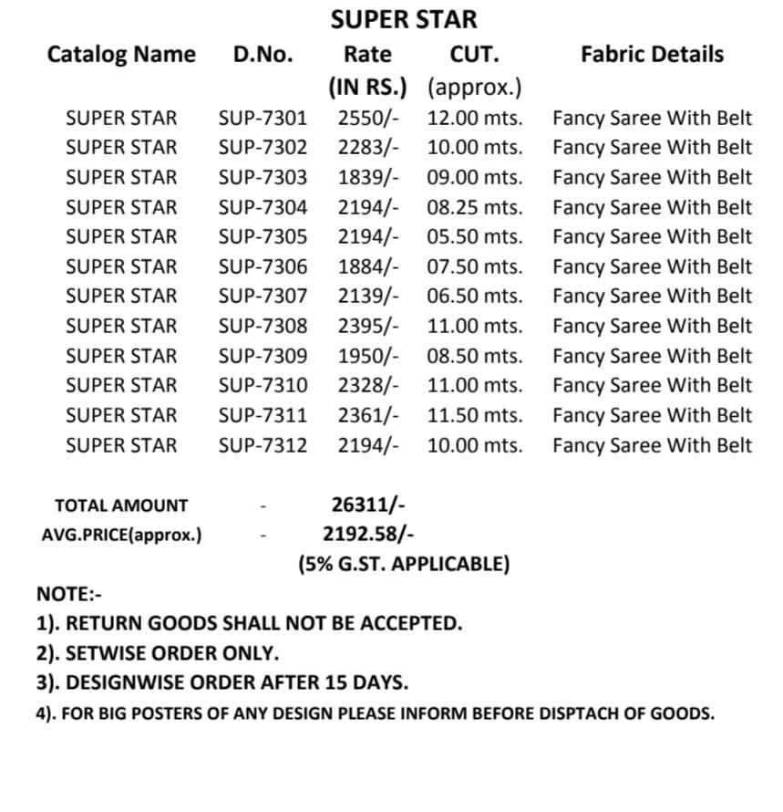 *BRAND : TFH* *CATALOG : SUPER STAR (7300 SERIES 7301 TO 7312)* *PRICE :- ATTACHED+5% GST EXTRA* *FABRIC -: FANCY SAREE WITH BELT* *SAREE STYLE - READY TO WEAR FREE SIZE WITH BELT* *AND BLOUSE UNSTITCHED* *SINGLE AVAILABLE* *READY TO SHIP* 100+single |