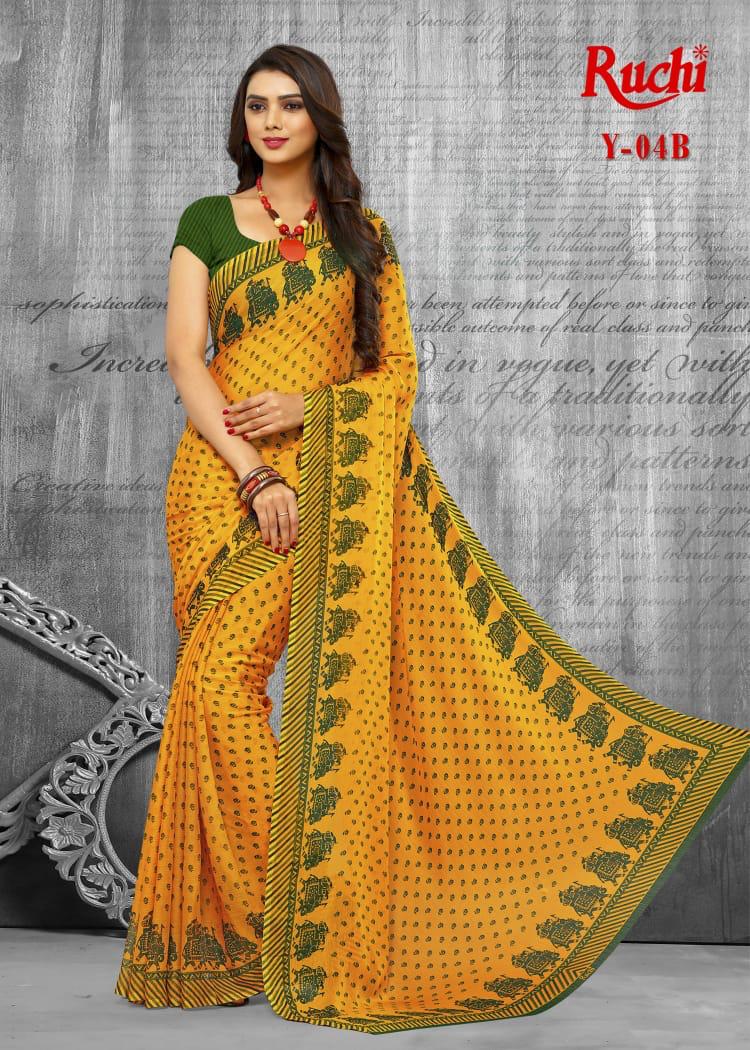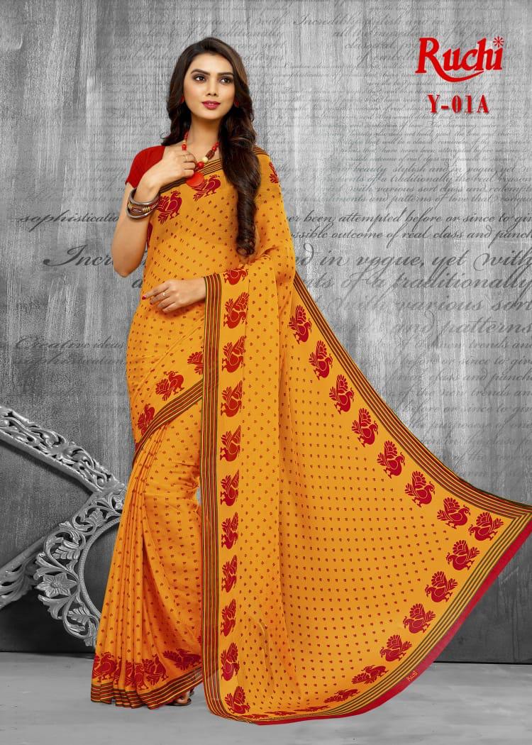 Brand - Ruchi . Type - saeee. Poster Name -SUPER KESAR CHIFFON ( Yellow special). D No Y-01 A & Y-01 B. Y- 02 A & Y-02 B. Y- 04 A & Y- 04 B. Fabric- Chiifon . Rate - 360 per Pcs . Single 460 * set & loose & Singel * GST 5 Percent Extra. Delivery from tomorrow |