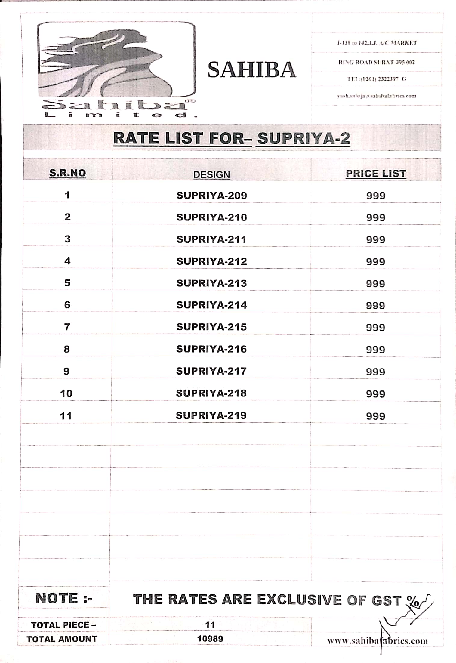 Buy Online Supriya By Sahiba Designer Saree Single And Set Stockiest And Supplier From Surat 11 Pcs of Full Catalogue at Wholesale Price. Looking for Supriya By Sahiba Designer Saree Single And Set Stockiest And Supplier From Surat Full Catalouge at Best Price? Buy Now Supriya By Sahiba Designer Saree Single And Set Stockiest And Supplier From Surat at Wholesale Rate of Rs 10989 with Total 11 Pcs from authroized dealer and supplier of SAHIBA Brand. Cost of Each piece is just only Rs 999 which is very low and affordable price to resale the product in your retail store ,This is Surat based Wholesale Supplier & Dealer of SAHIBA Brand. Click on Brand name to Know more about SAHIBA Brand's products.Call or Whatsapp on 9898838984 for booking or enquiry
