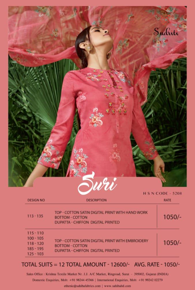 Buy Online Suri By Sahiba Cotton Digital Printed Suits Wholesale Supplier Gujarat 12 Pcs of Full Catalogue at Wholesale Price. Looking for Suri By Sahiba Cotton Digital Printed Suits Wholesale Supplier Gujarat Full Catalouge at Best Price? Buy Now Suri By Sahiba Cotton Digital Printed Suits Wholesale Supplier Gujarat at Wholesale Rate of Rs 12600 with Total 12 Pcs from authroized dealer and supplier of SAHIBA Brand. Cost of Each piece is just only Rs 1050 which is very low and affordable price to resale the product in your retail store ,This is Surat based Wholesale Supplier & Dealer of SAHIBA Brand. Click on Brand name to Know more about SAHIBA Brand's products.Call or Whatsapp on 9898838984 for booking or enquiry