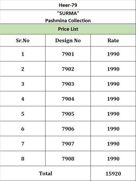 Buy Online Surma By Kimora Heer Series 7901 To 7908 Designer Party Wear Suits Wholesale Supplier Gujarat 8 Pcs of Full Catalogue at Wholesale Price. Looking for Surma By Kimora Heer Series 7901 To 7908 Designer Party Wear Suits Wholesale Supplier Gujarat Full Catalouge at Best Price? Buy Now Surma By Kimora Heer Series 7901 To 7908 Designer Party Wear Suits Wholesale Supplier Gujarat at Wholesale Rate of Rs 15920 with Total 8 Pcs from authroized dealer and supplier of KIMORA Brand. Cost of Each piece is just only Rs 1990 which is very low and affordable price to resale the product in your retail store ,This is Surat based Wholesale Supplier & Dealer of KIMORA Brand. Click on Brand name to Know more about KIMORA Brand's products.Call or Whatsapp on 9898838984 for booking or enquiry