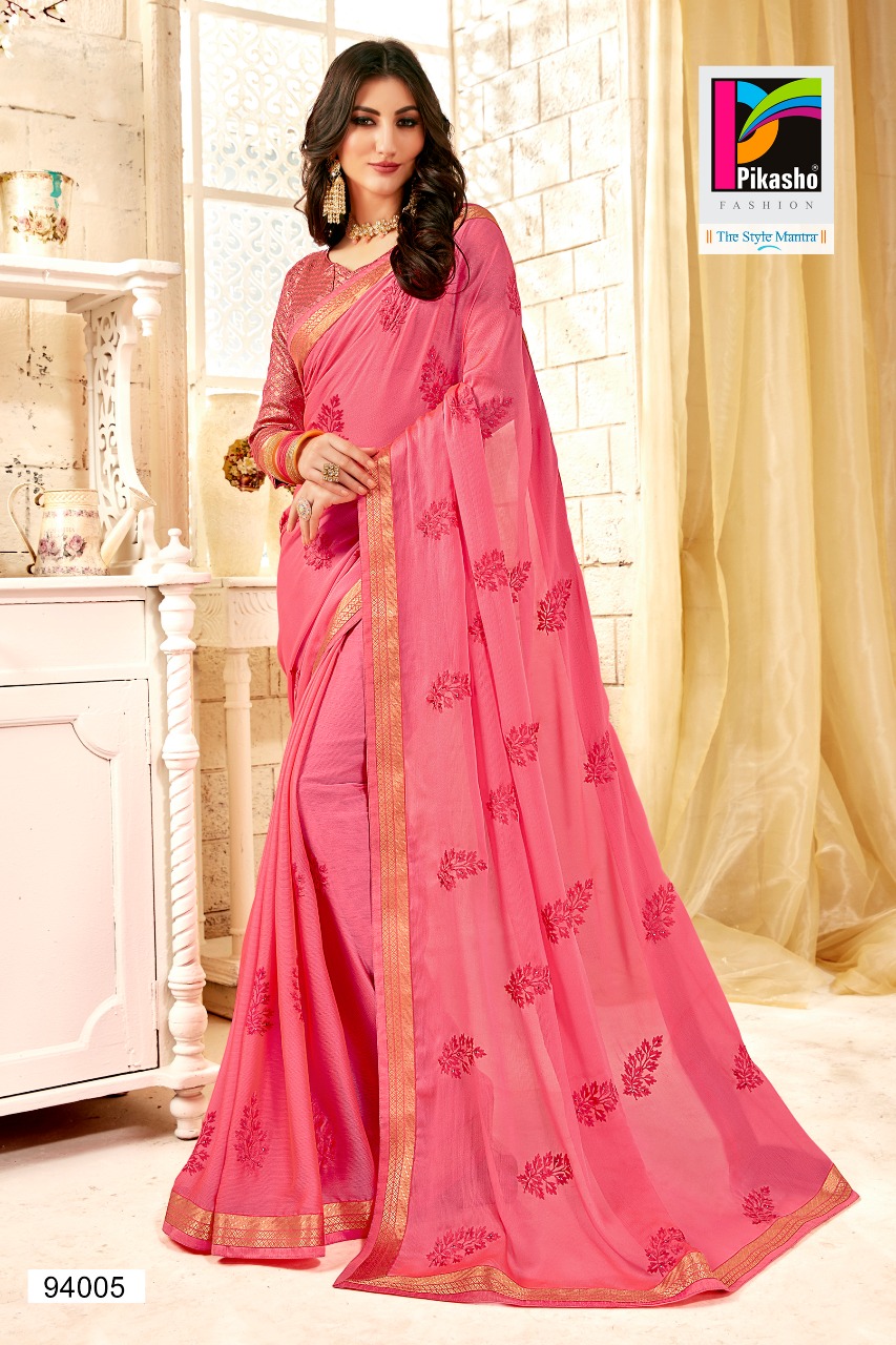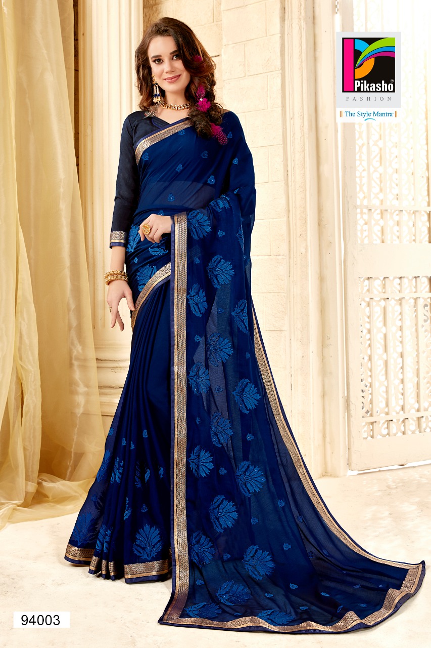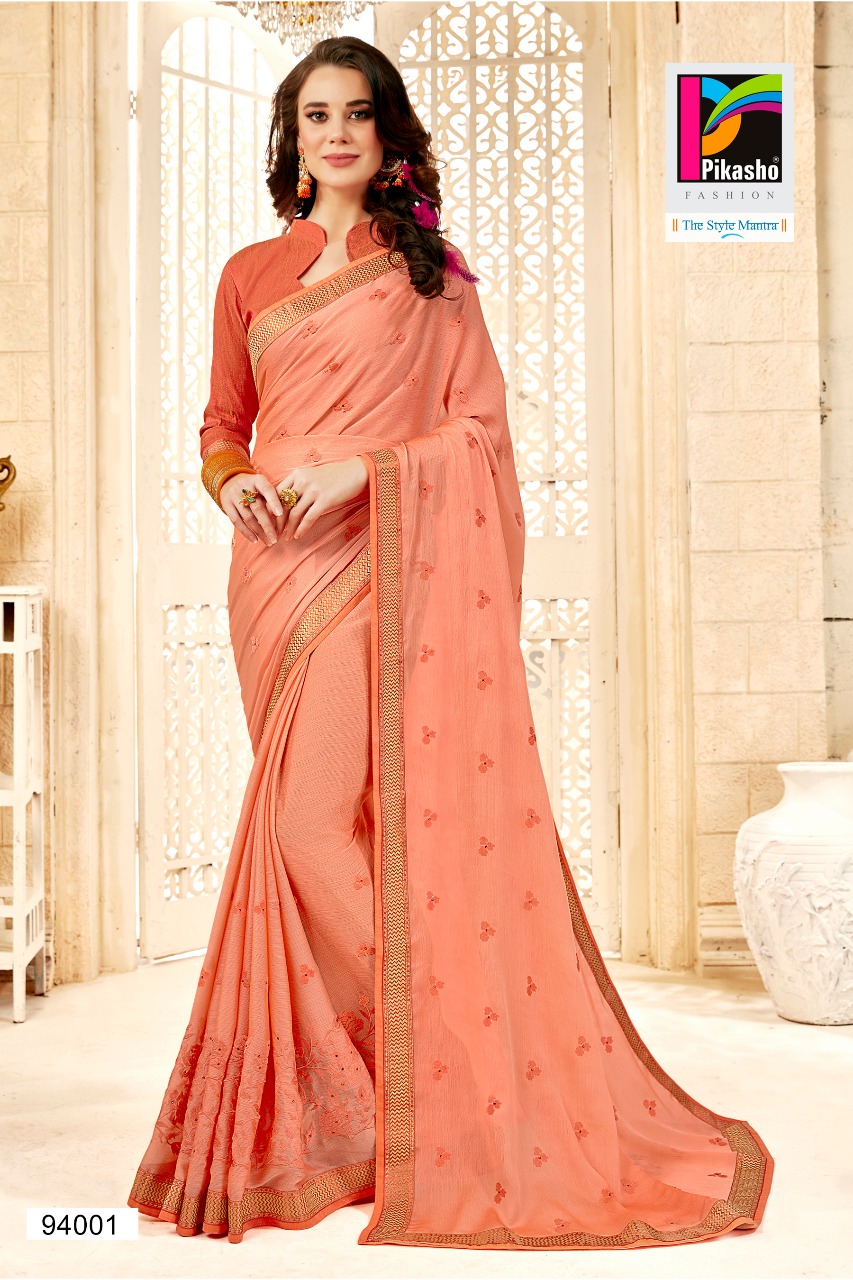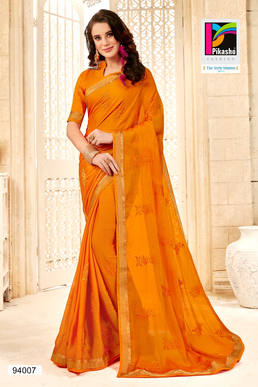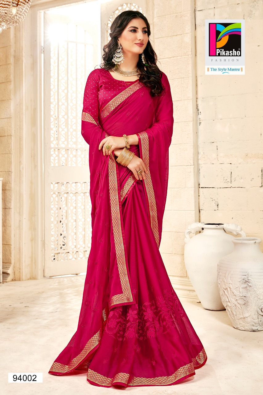 Buy Online Sushmita By Pikasho Fashion Series 94001 To 94010 Fancy Designer Party Wear Sarees Wholesale Supplier Surat 10 Pcs of Full Catalogue at Wholesale Price. Looking for Sushmita By Pikasho Fashion Series 94001 To 94010 Fancy Designer Party Wear Sarees Wholesale Supplier Surat Full Catalouge at Best Price? Buy Now Sushmita By Pikasho Fashion Series 94001 To 94010 Fancy Designer Party Wear Sarees Wholesale Supplier Surat at Wholesale Rate of Rs 9500 with Total 10 Pcs from authroized dealer and supplier of Pikasho Fashion Brand. Cost of Each piece is just only Rs 950 which is very low and affordable price to resale the product in your retail store ,This is Surat based Wholesale Supplier & Dealer of Pikasho Fashion Brand. Click on Brand name to Know more about Pikasho Fashion Brand's products.Call or Whatsapp on 9898838984 for booking or enquiry