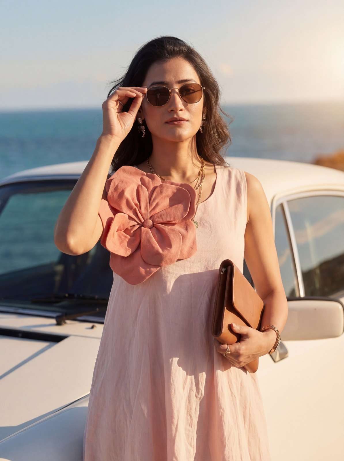 SW-DR-001 Peach rate 1725/- SIZE XS TO XL 5%Peach Cotton floral DressDressesPeach colored pure cotton mini dress with bold orange 3D floral design and matching shorts. Elegant, breathable, and handcrafted by Swaruchii."Fabric: soft, breathable cotton ,gentle on skin, ideal for all-day comfort. Details: 3D petals, braids, and floral appliqués crafted from premium linen for a refined finish. Crafted with care for durability, comfort, and timeless elegance."CottonFit and FlareRound NeckSolidAbove KneeSleevelessZipReady to Wear1short1 Dress +1 SHORT |
