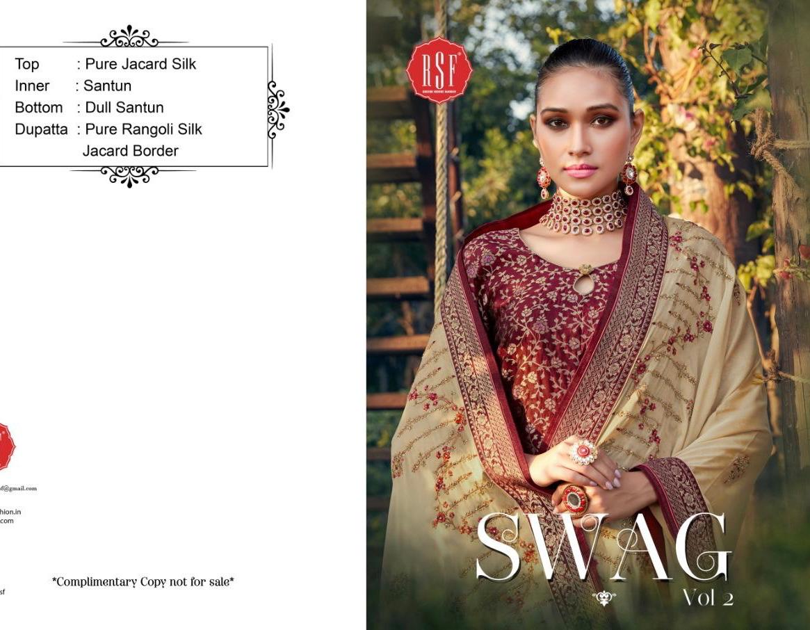 Buy Online Swag Vol 2 By Rsf Dress Materials Wholesale Supplier India 6 Pcs of Full Catalogue at Wholesale Price. Looking for Swag Vol 2 By Rsf Dress Materials Wholesale Supplier India Full Catalouge at Best Price? Buy Now Swag Vol 2 By Rsf Dress Materials Wholesale Supplier India at Wholesale Rate of Rs 7770 with Total 6 Pcs from authroized dealer and supplier of RSF Brand. Cost of Each piece is just only Rs 1295 which is very low and affordable price to resale the product in your retail store ,This is Surat based Wholesale Supplier & Dealer of RSF Brand. Click on Brand name to Know more about RSF Brand's products.Call or Whatsapp on 9898838984 for booking or enquiry