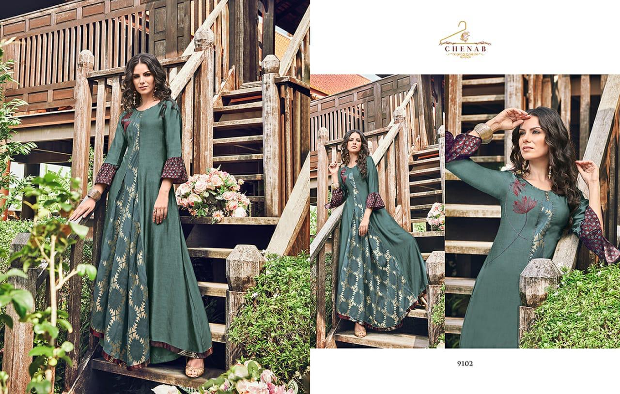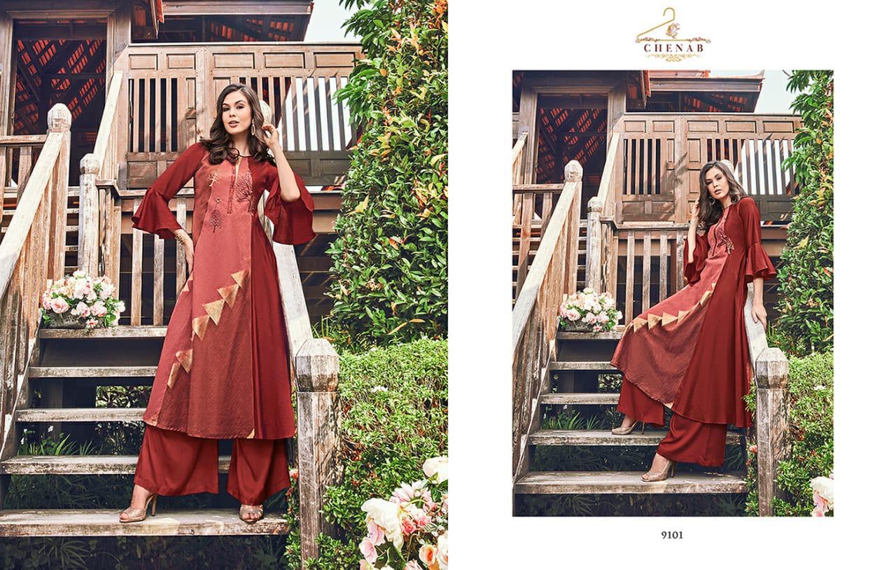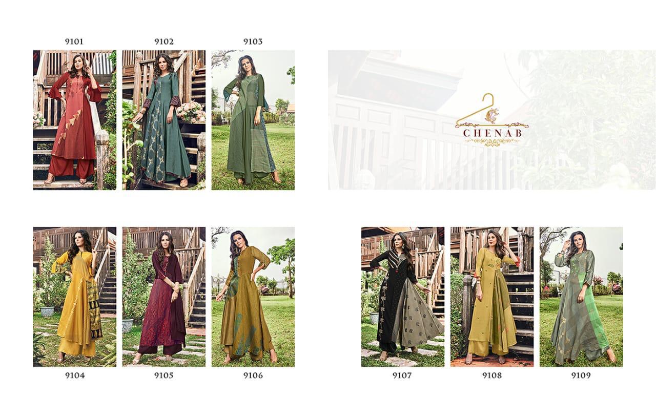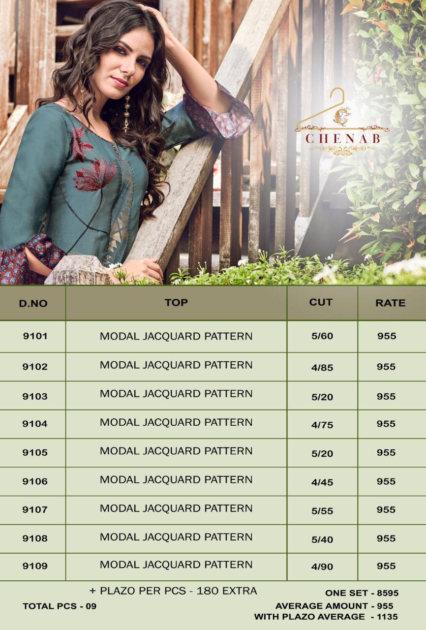 Brand - Swagat Chenab . Series -9101 to 9109. Set & Loose & Singel. Single Extra 100 on company price list GST 5 Percent Extra. With plazzo rate come Rate diff Delivery- Running |