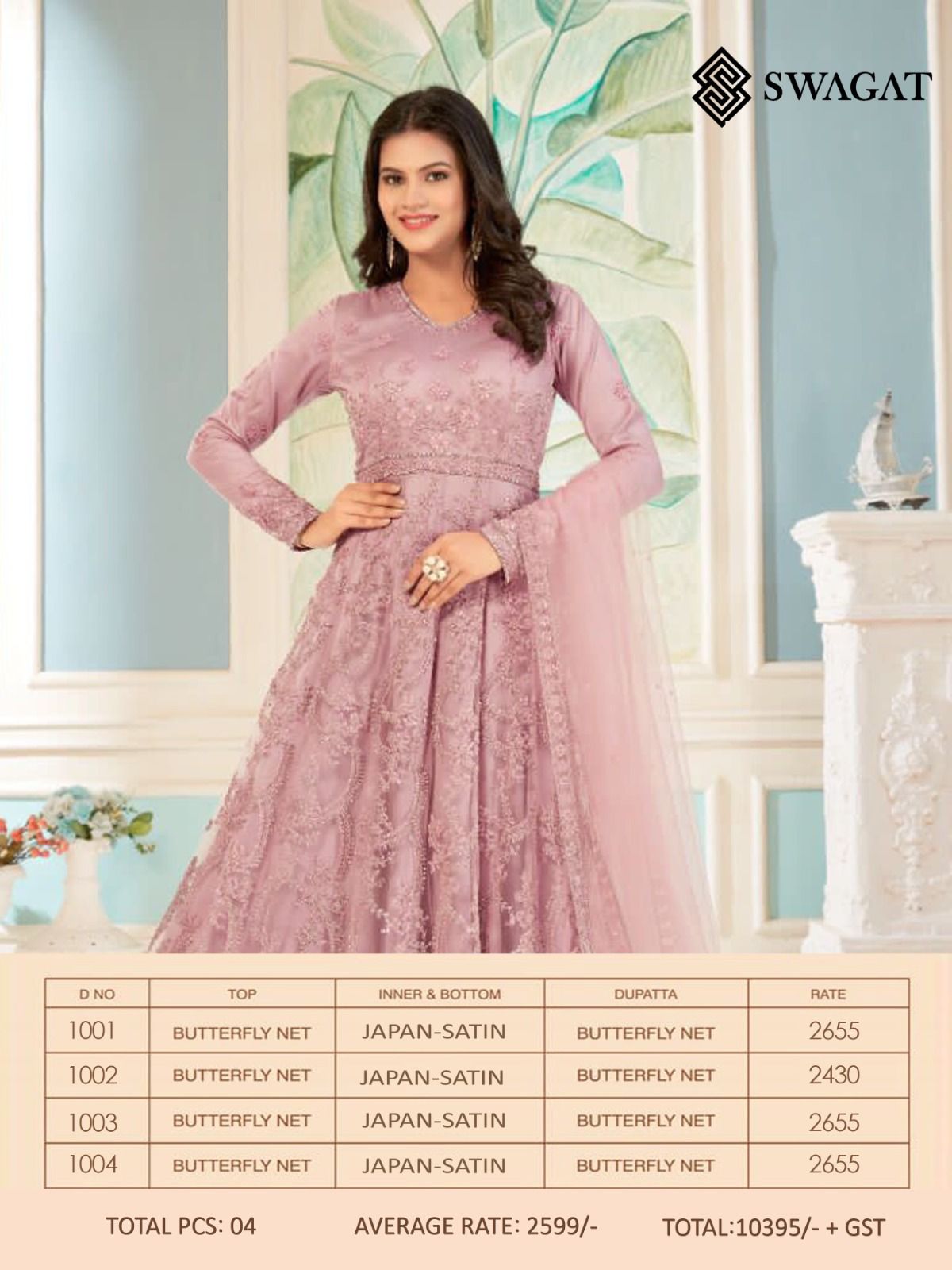 Buy Online Swagat Series 1001 To 1004 Heavy Net Anarkali Dress 4 Pcs of Full Catalogue at Wholesale Price. Looking for Swagat Series 1001 To 1004 Heavy Net Anarkali Dress Full Catalouge at Best Price? Buy Now Swagat Series 1001 To 1004 Heavy Net Anarkali Dress at Wholesale Rate of Rs 0 with Total 4 Pcs from authroized dealer and supplier of SWAGAT Brand. Cost of Each piece is just only Rs 0 which is very low and affordable price to resale the product in your retail store ,This is Surat based Wholesale Supplier & Dealer of SWAGAT Brand. Click on Brand name to Know more about SWAGAT Brand's products.Call or Whatsapp on 9898838984 for booking or enquiry
