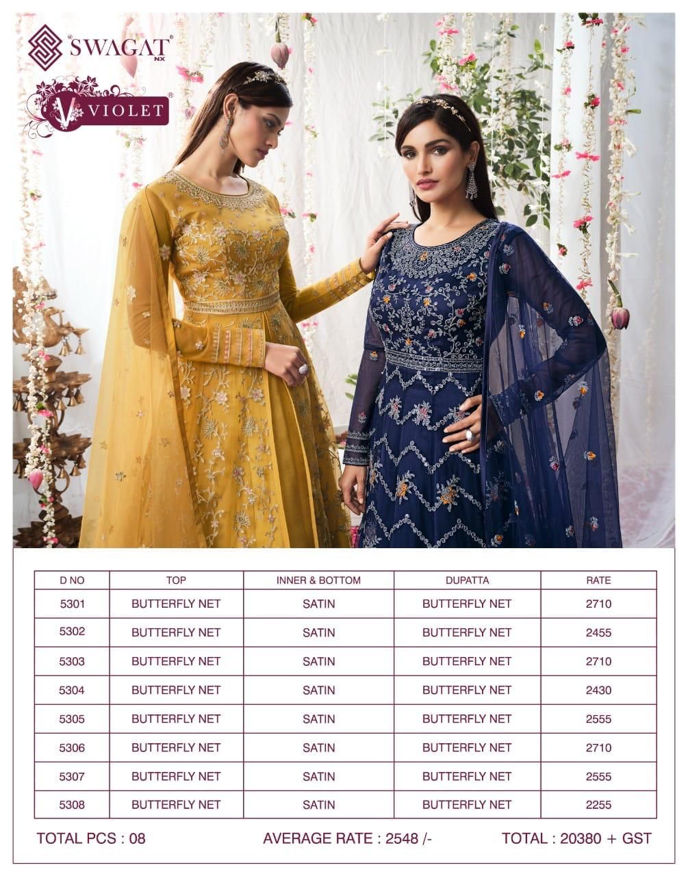 Buy Online Swagat Voilet Series 5301 To 5308 Designer Party Wear Suit Single And Set Stockiest And Supplier From Surat 8 Pcs of Full Catalogue at Wholesale Price. Looking for Swagat Voilet Series 5301 To 5308 Designer Party Wear Suit Single And Set Stockiest And Supplier From Surat Full Catalouge at Best Price? Buy Now Swagat Voilet Series 5301 To 5308 Designer Party Wear Suit Single And Set Stockiest And Supplier From Surat at Wholesale Rate of Rs 0 with Total 8 Pcs from authroized dealer and supplier of SWAGAT Brand. Cost of Each piece is just only Rs 0 which is very low and affordable price to resale the product in your retail store ,This is Surat based Wholesale Supplier & Dealer of SWAGAT Brand. Click on Brand name to Know more about SWAGAT Brand's products.Call or Whatsapp on 9898838984 for booking or enquiry
