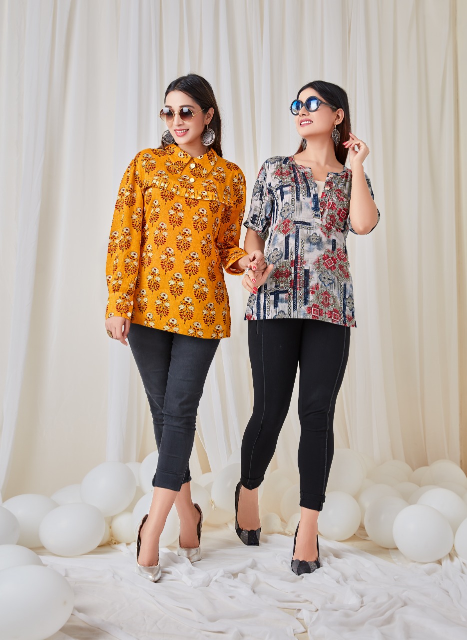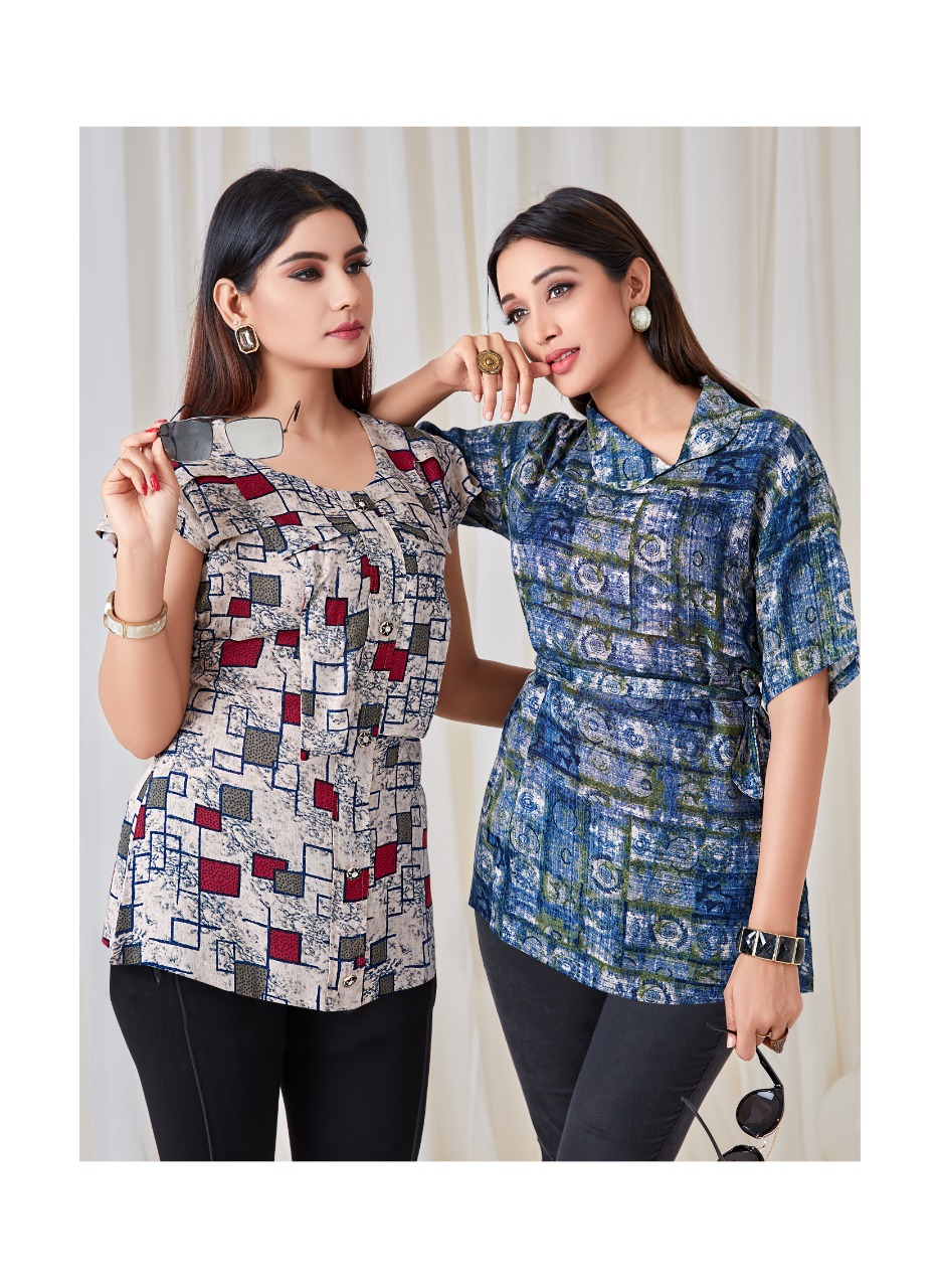 *KALAKARI nx* *Think Rich* *Look rich* *feeling rich* *wearing rich* *Then way wearing always rayon 14 kg print dyed* ?? *short top*?? Catalogue name- *SWAR VOL 2"* ?Details :- *NEW STITCHING STYLE* *Different ways different think* ?Fabrics - *Viscose Reyon Print* *With self stretchable rinkles fabric* ?Size - *M(38)* *L(40)* *XL(42)* *XXL(44)* *XXXL(46)* ? Length --> *29+"* ?Designs- *6* pcs Rate- *395/-* ? *5% GST* |