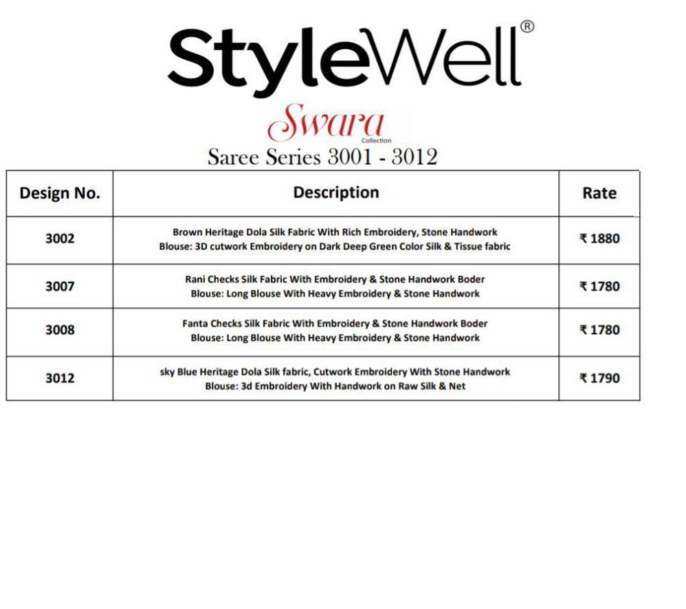 Buy Online Swara By Stylewell Series 3002, 3007, 3008, 3012 Single And Set Stockiest And Supplier From Surat 4 Pcs of Full Catalogue at Wholesale Price. Looking for Swara By Stylewell Series 3002, 3007, 3008, 3012 Single And Set Stockiest And Supplier From Surat Full Catalouge at Best Price? Buy Now Swara By Stylewell Series 3002, 3007, 3008, 3012 Single And Set Stockiest And Supplier From Surat at Wholesale Rate of Rs 0 with Total 4 Pcs from authroized dealer and supplier of STYLE WELL Brand. Cost of Each piece is just only Rs 0 which is very low and affordable price to resale the product in your retail store ,This is Surat based Wholesale Supplier & Dealer of STYLE WELL Brand. Click on Brand name to Know more about STYLE WELL Brand's products.Call or Whatsapp on 9898838984 for booking or enquiry