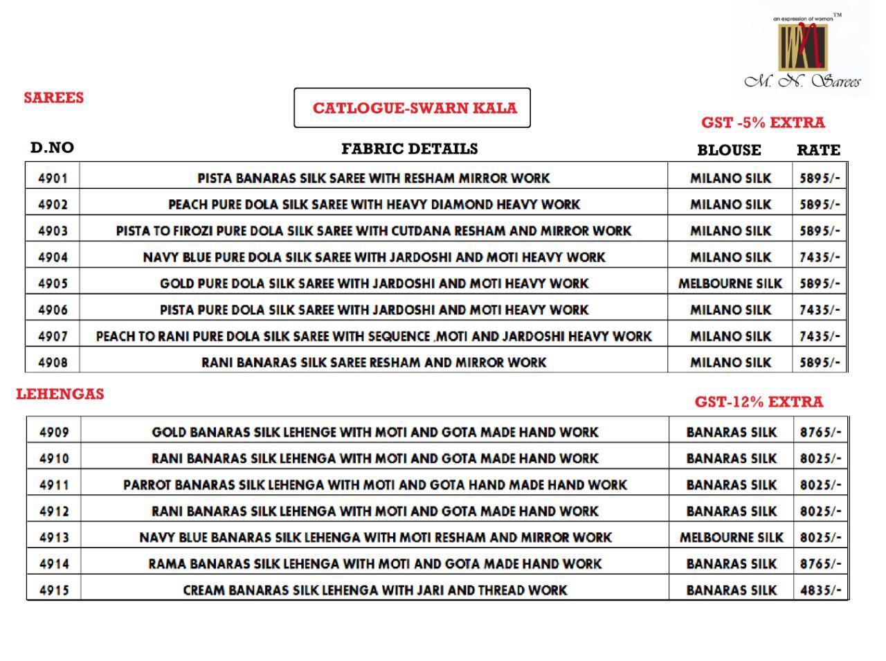Buy Online Swarn Kala By M N Sarees 4901 Series Fancy Party Wear Saree And Lehenga Collection Wholesaler Surat 15 Pcs of Full Catalogue at Wholesale Price. Looking for Swarn Kala By M N Sarees 4901 Series Fancy Party Wear Saree And Lehenga Collection Wholesaler Surat Full Catalouge at Best Price? Buy Now Swarn Kala By M N Sarees 4901 Series Fancy Party Wear Saree And Lehenga Collection Wholesaler Surat at Wholesale Rate of Rs 0 with Total 15 Pcs from authroized dealer and supplier of MN SAREES Brand. Cost of Each piece is just only Rs 0 which is very low and affordable price to resale the product in your retail store ,This is Surat based Wholesale Supplier & Dealer of MN SAREES Brand. Click on Brand name to Know more about MN SAREES Brand's products.Call or Whatsapp on 9898838984 for booking or enquiry