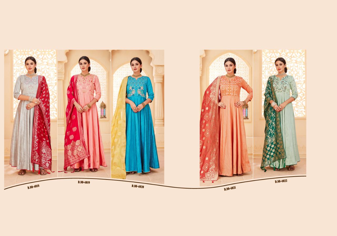 This festive season, Mrigya Launches Catalog ? Catalog : *SWARNA 3* By *Mrigya Â?* ? *Size ? : M L XL XXL* *38 40 42 44* *Fabric* : *Handloom Long Slub Gown with Santoon inner, hand work & Viscose Dola Silk Banarasi Jacquard Dupatta with lace* *Price* : *1675* per Pcs . GST extra Set To Set . *Pieces* : *5 pcs* Despatch from 30th APRIL |