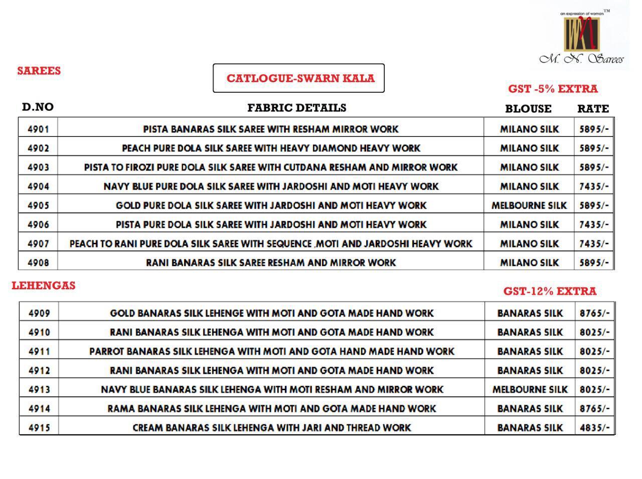Buy Online Swarna Kala By Mn Series 4901 To 4915 Silk Designer Party Wear Lehngas And Sarees Wholesale Supplier Surat 15 Pcs of Full Catalogue at Wholesale Price. Looking for Swarna Kala By Mn Series 4901 To 4915 Silk Designer Party Wear Lehngas And Sarees Wholesale Supplier Surat Full Catalouge at Best Price? Buy Now Swarna Kala By Mn Series 4901 To 4915 Silk Designer Party Wear Lehngas And Sarees Wholesale Supplier Surat at Wholesale Rate of Rs 0 with Total 15 Pcs from authroized dealer and supplier of Brand. Cost of Each piece is just only Rs 0 which is very low and affordable price to resale the product in your retail store ,This is Surat based Wholesale Supplier & Dealer of Brand. Click on Brand name to Know more about Brand's products.Call or Whatsapp on 9898838984 for booking or enquiry