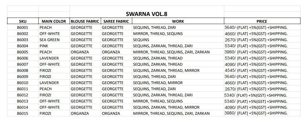 Hello... Dear Partners Greetings from ARYA DESIGNS..! We have introduced a New catalog " SWARNA VOL-8 " Kindly upload it ASAP. "SWARNA VOL-8" GST SHIP EXTRA ======================== SINGLE AVAILABLE 100+ SINGLE |