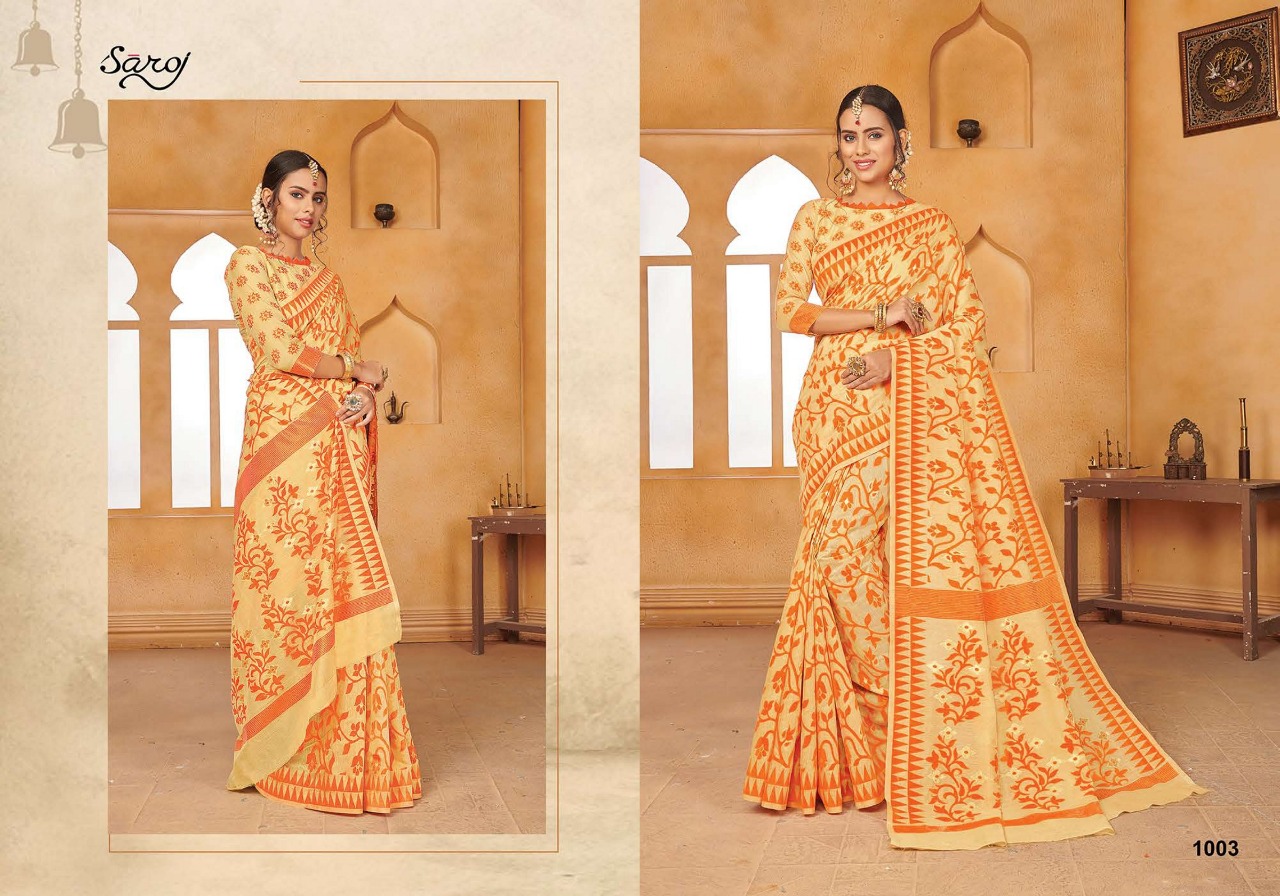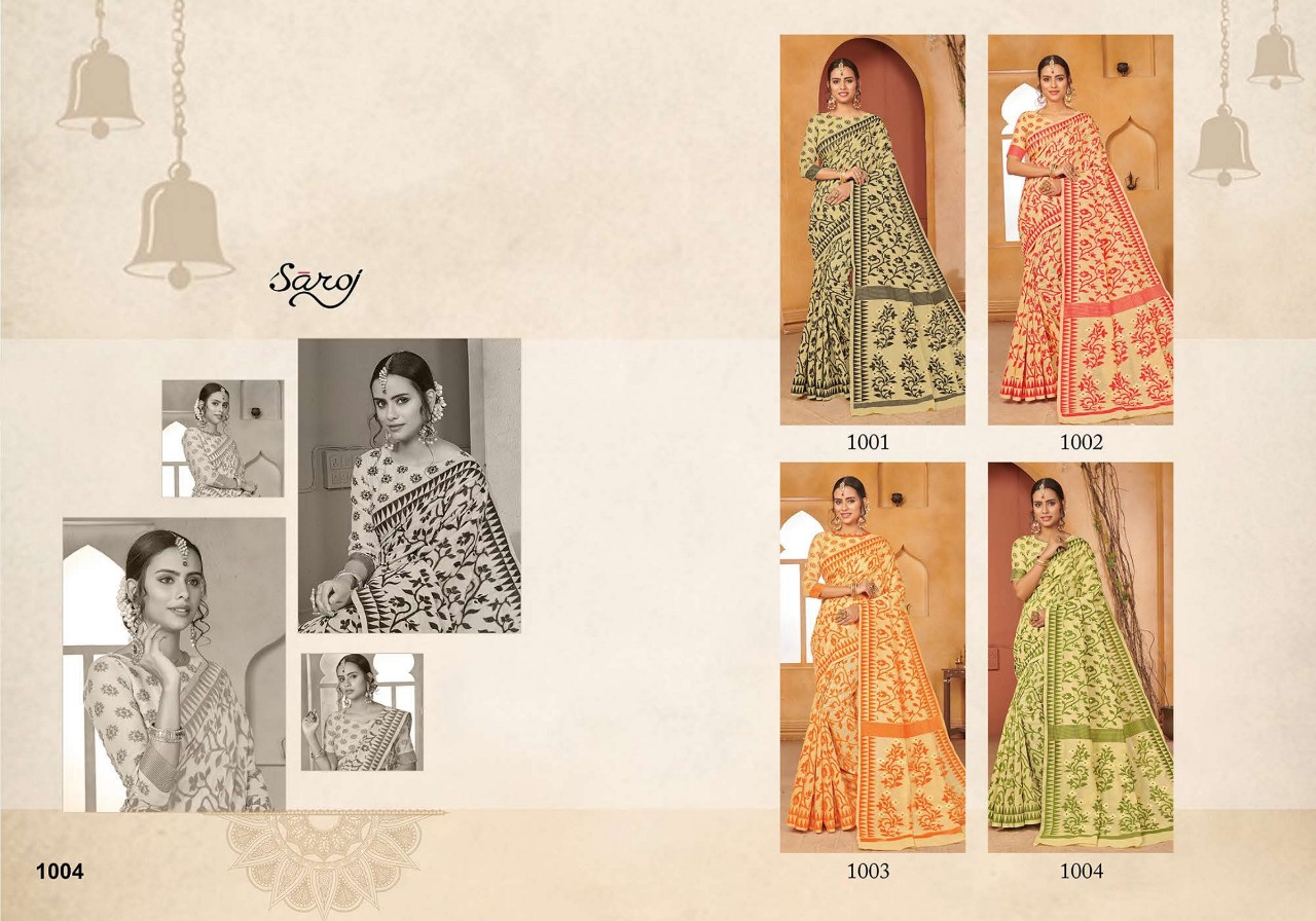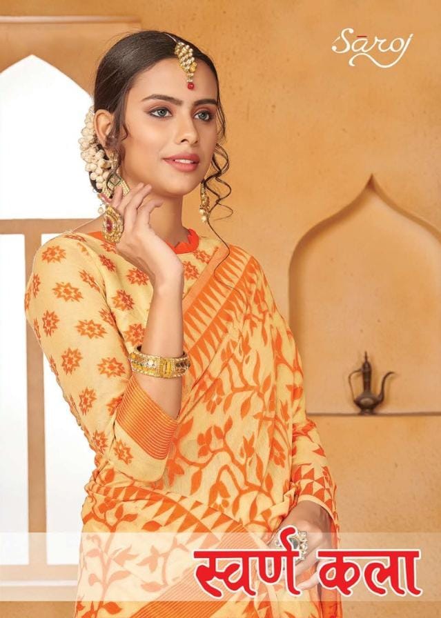 Brand - Saroj . *Swarnkala (Rs.715 per pcs )* Set to set Fabric: Cotton Brasso. Blouse: Cotton. 4 Design in set. Delivery from tomorrow |