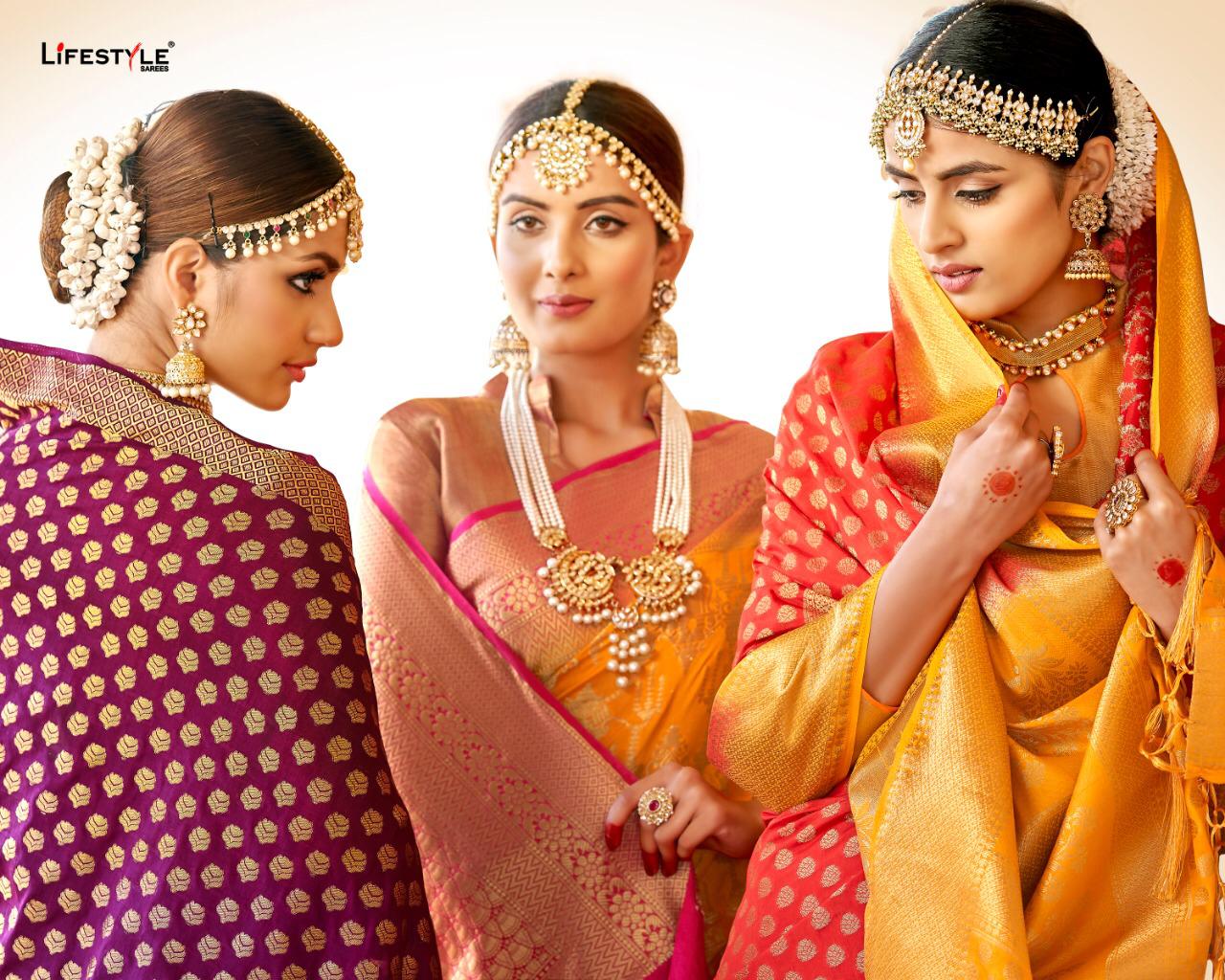 Brand - Lifestyle. Catlog name - SWARNPARI . Rate - 1225 per Pcs . Weaving Handloom silk Fabric. Set To Set. GST 5 Percent Extra . Delivery- READY. |