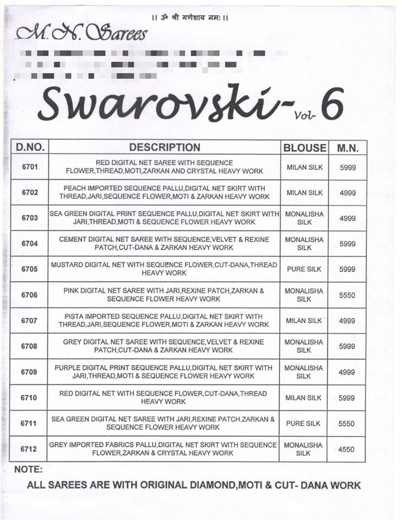 Mn saree Swarovski vol 6 Series 6701 to 6712 Rate list attached Gst ship extra Single available 100+single |