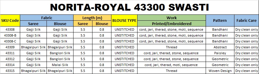 ? OUR NEW FESTIVE WEAR SAREE COLLECTION ? BRAND NAME : MAHOTSAV CATALOG NAME : NORITA ROYAL "SWASTI" 43300 - SERIES FABRIC : ATTACHED PRICE : 43308-2085/- 43309-1885/- 43311-1935/- 43312-1885/- 43314-1935/- 43315-1995/- + 5% GST EXTRA SINGLES AVAILABLE ? 100+ SINGLE |