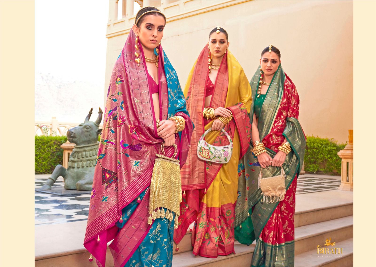 A Delicate And Lightweight Fabric Known For Its Sheer Texture And Smooth Feel. P.V Silk Is Revered For Its Luxurious Appearance And Is Often Used In Creating Premium Traditional Indian Attire. Brand : Trirath Catalog: Swastik Series :10248 To 10253 Saree : Super Pv Silk With Paithini Design With Apoxy Finish Blouse : Super Pv Silk Price : 1495/-+5%GST Occasion : Festival Wear 100+ SINGLE |