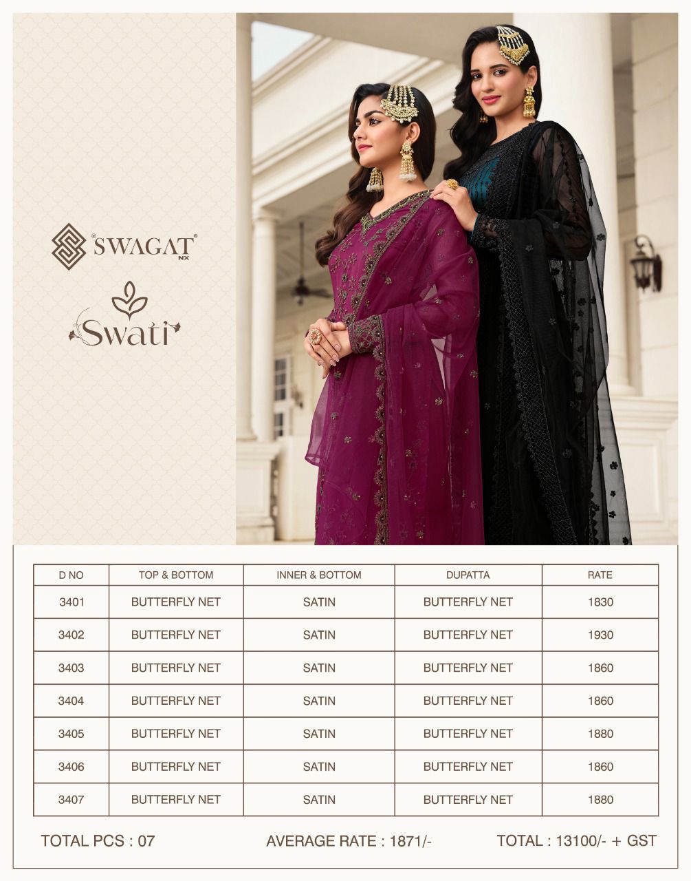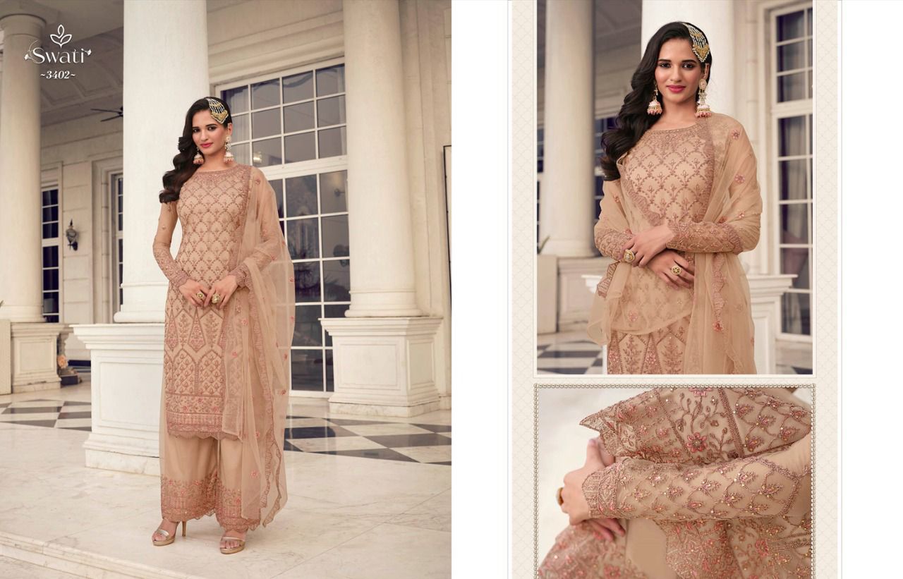 Buy Online Swati Series 3401 To 3407 By Swagat Heavy Net Work Suit Designer Party Wear Collection Single And Set Stockiest And Supplier From Surat Gujarat 7 Pcs of Full Catalogue at Wholesale Price. Looking for Swati Series 3401 To 3407 By Swagat Heavy Net Work Suit Designer Party Wear Collection Single And Set Stockiest And Supplier From Surat Gujarat Full Catalouge at Best Price? Buy Now Swati Series 3401 To 3407 By Swagat Heavy Net Work Suit Designer Party Wear Collection Single And Set Stockiest And Supplier From Surat Gujarat at Wholesale Rate of Rs 13097 with Total 7 Pcs from authroized dealer and supplier of SWAGAT Brand. Cost of Each piece is just only Rs 1871 which is very low and affordable price to resale the product in your retail store ,This is Surat based Wholesale Supplier & Dealer of SWAGAT Brand. Click on Brand name to Know more about SWAGAT Brand's products.Call or Whatsapp on 9898838984 for booking or enquiry