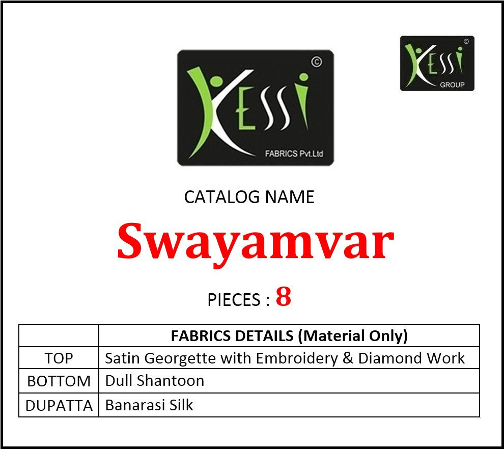 Buy Online Swayamvar By Kessi Satin Georgette Designer Suits Wholesale Supplier Gujarat 8 Pcs of Full Catalogue at Wholesale Price. Looking for Swayamvar By Kessi Satin Georgette Designer Suits Wholesale Supplier Gujarat Full Catalouge at Best Price? Buy Now Swayamvar By Kessi Satin Georgette Designer Suits Wholesale Supplier Gujarat at Wholesale Rate of Rs 10392 with Total 8 Pcs from authroized dealer and supplier of KESSI Brand. Cost of Each piece is just only Rs 1299 which is very low and affordable price to resale the product in your retail store ,This is Surat based Wholesale Supplier & Dealer of KESSI Brand. Click on Brand name to Know more about KESSI Brand's products.Call or Whatsapp on 9898838984 for booking or enquiry