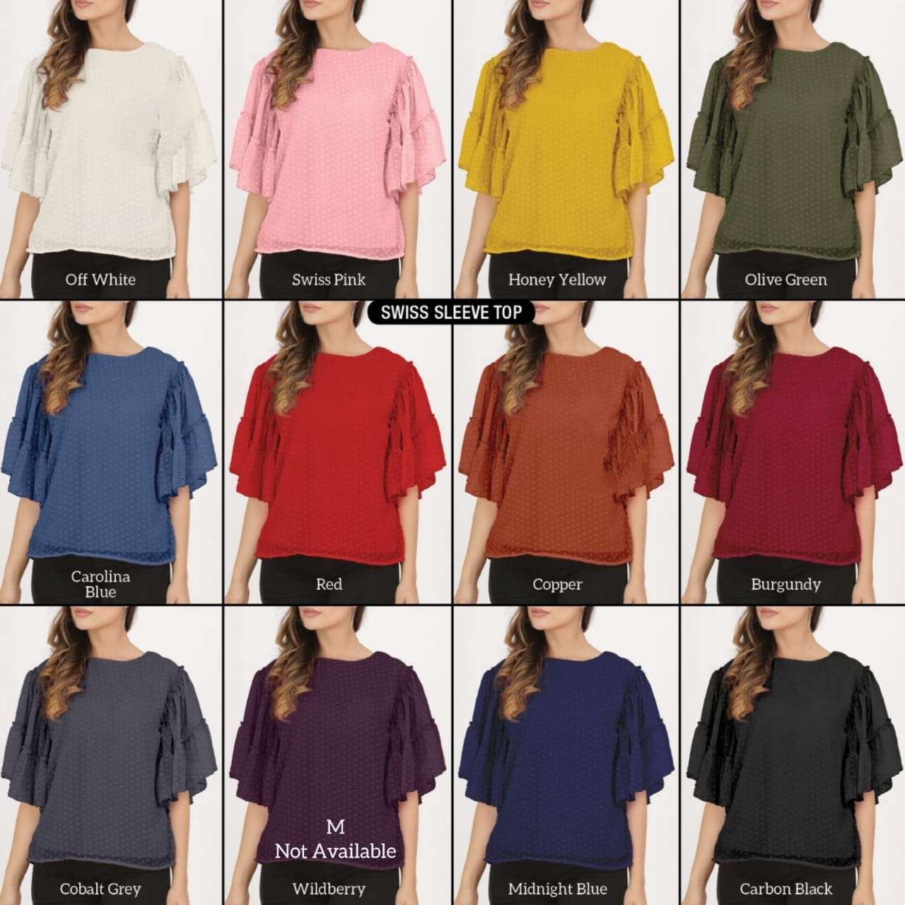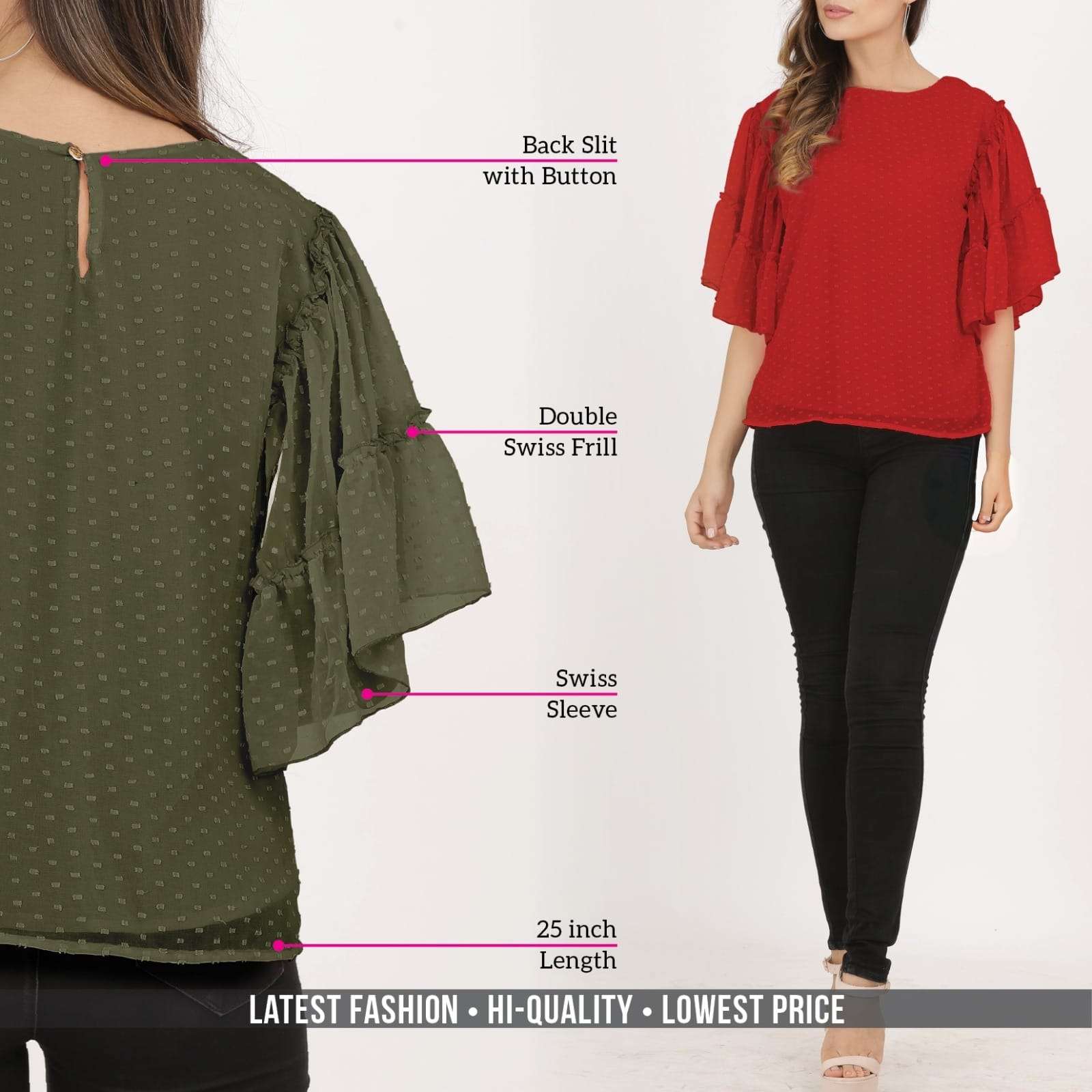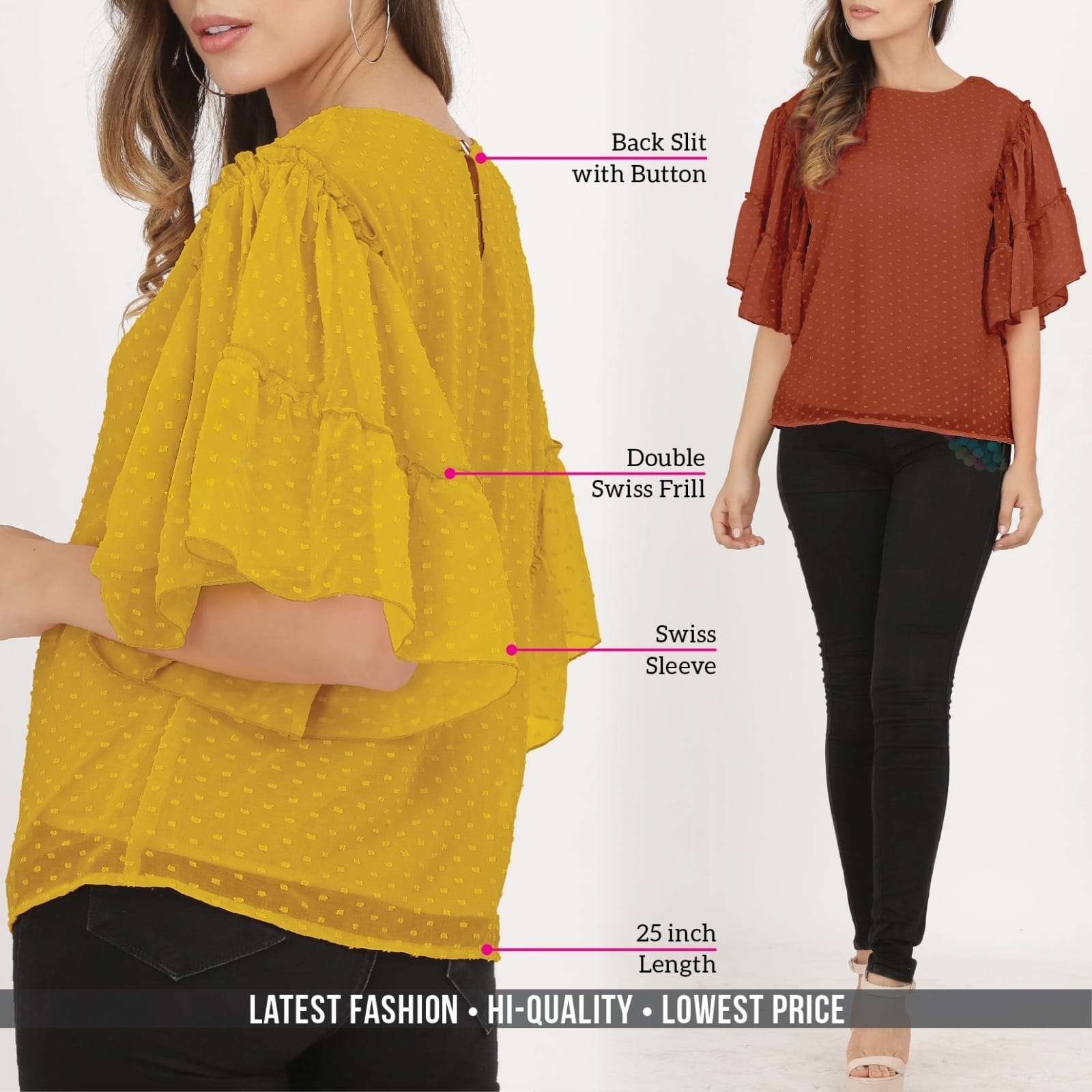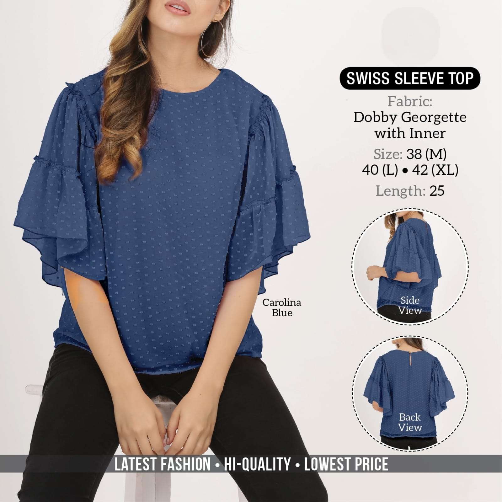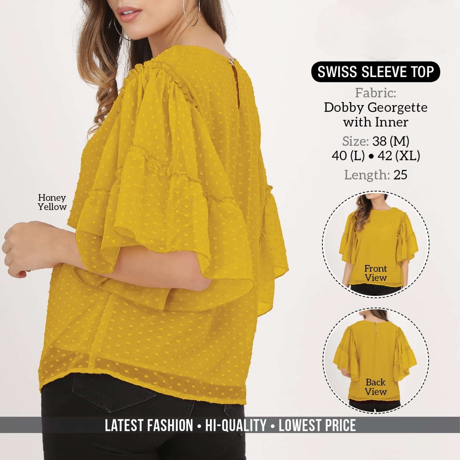 *SWISS SLEEVE TOP* *Fabric:* Dobby Georgette with Inner *Style:* Western *USP1:* Double Swiss Frill *USP2:* Swiss Sleevel *Feature1:* Back Slit with Button