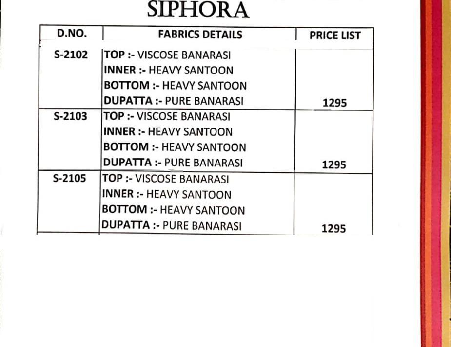 Buy Online Sybella Siphora Series S 2101 Designer Suits Set And Single Wholesale Supplier And Dealer Gujarat 1295 Pcs of Full Catalogue at Wholesale Price. Looking for Sybella Siphora Series S 2101 Designer Suits Set And Single Wholesale Supplier And Dealer Gujarat Full Catalouge at Best Price? Buy Now Sybella Siphora Series S 2101 Designer Suits Set And Single Wholesale Supplier And Dealer Gujarat at Wholesale Rate of Rs 0 with Total 1295 Pcs from authroized dealer and supplier of SYBELLA Brand. Cost of Each piece is just only Rs 0 which is very low and affordable price to resale the product in your retail store ,This is Surat based Wholesale Supplier & Dealer of SYBELLA Brand. Click on Brand name to Know more about SYBELLA Brand's products.Call or Whatsapp on 9898838984 for booking or enquiry