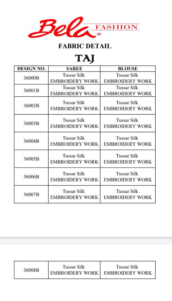 Buy Online Taj By Bela Series 36000b Silk Sarees Wholesale Supplier Gujarat 7 Pcs of Full Catalogue at Wholesale Price. Looking for Taj By Bela Series 36000b Silk Sarees Wholesale Supplier Gujarat Full Catalouge at Best Price? Buy Now Taj By Bela Series 36000b Silk Sarees Wholesale Supplier Gujarat at Wholesale Rate of Rs 12285 with Total 7 Pcs from authroized dealer and supplier of BELA Brand. Cost of Each piece is just only Rs 1755 which is very low and affordable price to resale the product in your retail store ,This is Surat based Wholesale Supplier & Dealer of BELA Brand. Click on Brand name to Know more about BELA Brand's products.Call or Whatsapp on 9898838984 for booking or enquiry