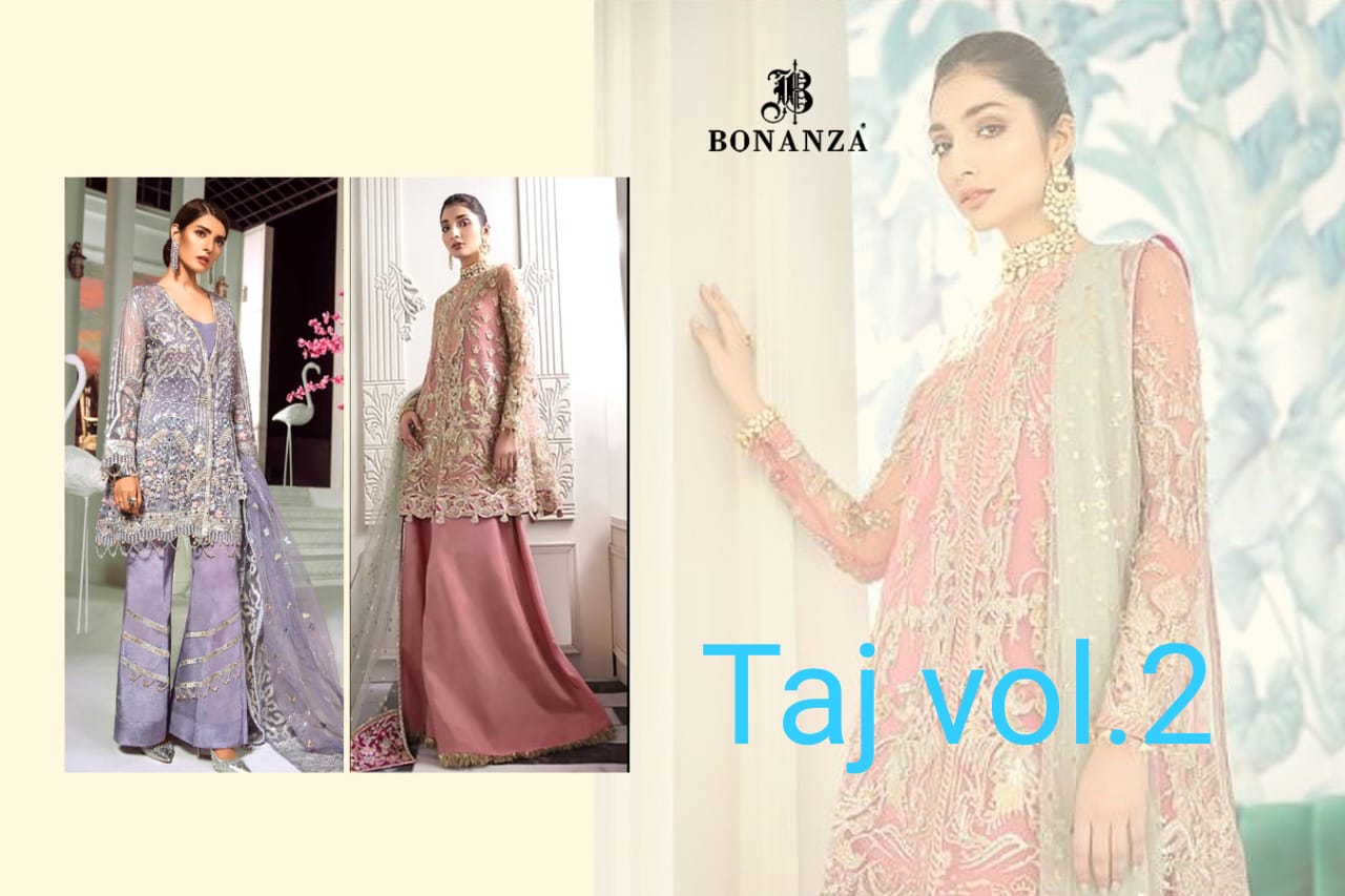 Buy Online Taj Vol 2 By Bonanza Pakistani Suits Wholesale Supplier And Dealer Gujarat 2 Pcs of Full Catalogue at Wholesale Price. Looking for Taj Vol 2 By Bonanza Pakistani Suits Wholesale Supplier And Dealer Gujarat Full Catalouge at Best Price? Buy Now Taj Vol 2 By Bonanza Pakistani Suits Wholesale Supplier And Dealer Gujarat at Wholesale Rate of Rs 2398 with Total 2 Pcs from authroized dealer and supplier of Brand. Cost of Each piece is just only Rs 1199 which is very low and affordable price to resale the product in your retail store ,This is Surat based Wholesale Supplier & Dealer of Brand. Click on Brand name to Know more about Brand's products.Call or Whatsapp on 9898838984 for booking or enquiry