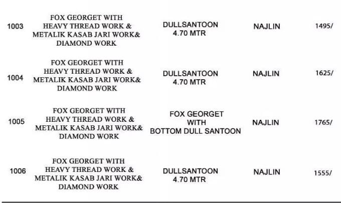 Jai mata dii Today new lounching our new catlogue *Volono Trendz* Lounching a new catalouge with *Ayesha takia* Catalog name :- *Takia vol.1 nx* Designs :- 4pcs Top :- Foux Georget With Heavy Thread Work Metalik Kasab Jari Work With Daimond Work Inner:- Dull Santoon Duppta Â? Najling Rate :- 1595/- ? GST 5% Fabric and price attech list ????? Booking started from now |