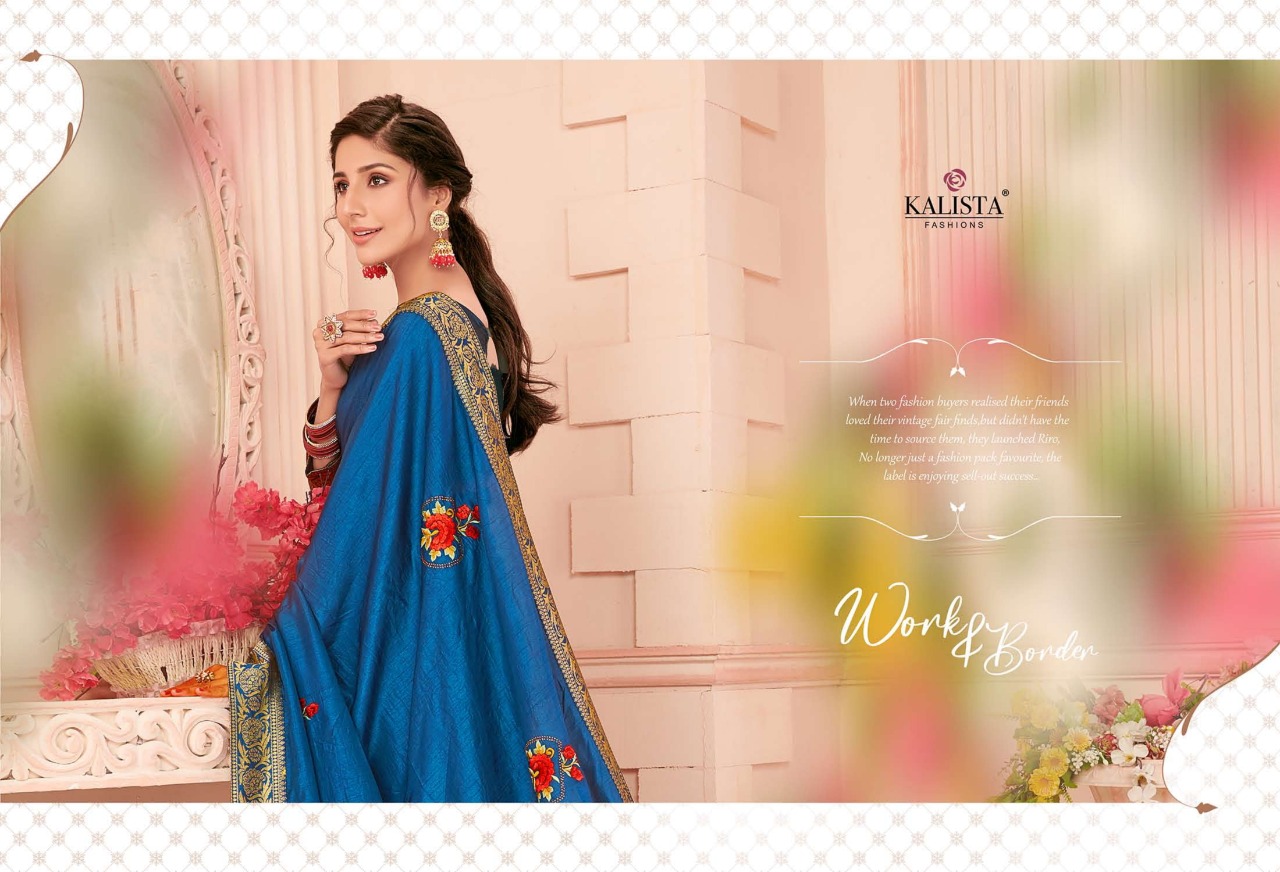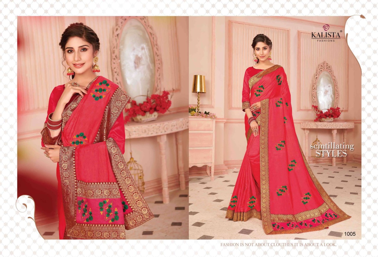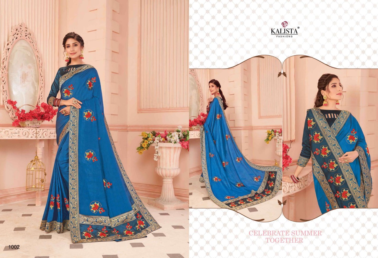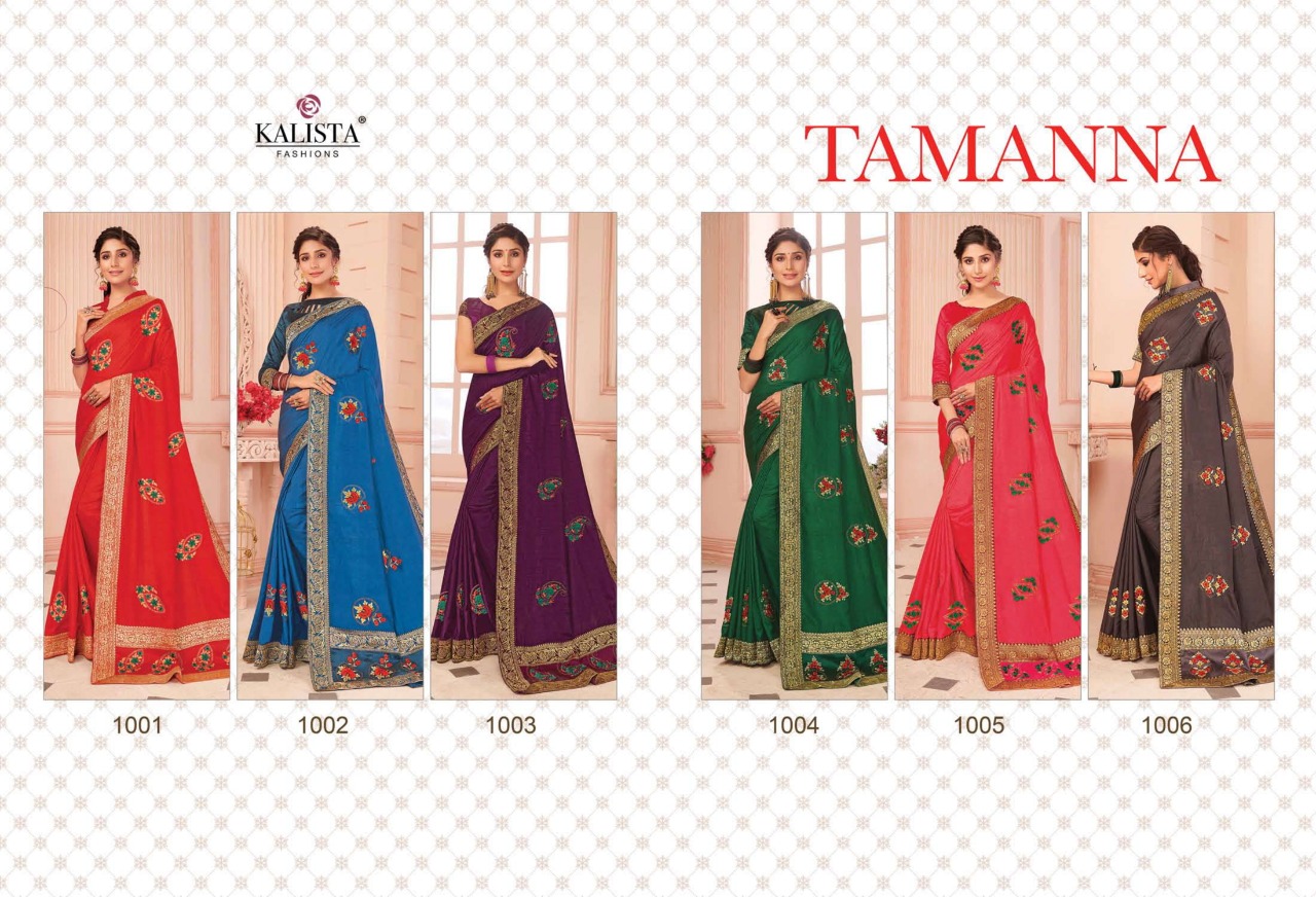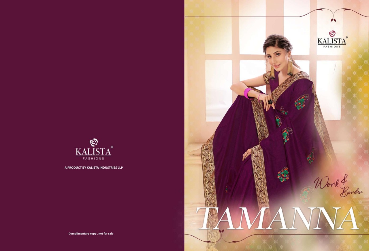 Brand - Kalista . Type - saree. Catlog name - TAMANNA . Rate- 950 per PCs . Set to set. GST 5 Percent Extra. Fabric- Vichitra silk . Delivery from tomorrow |